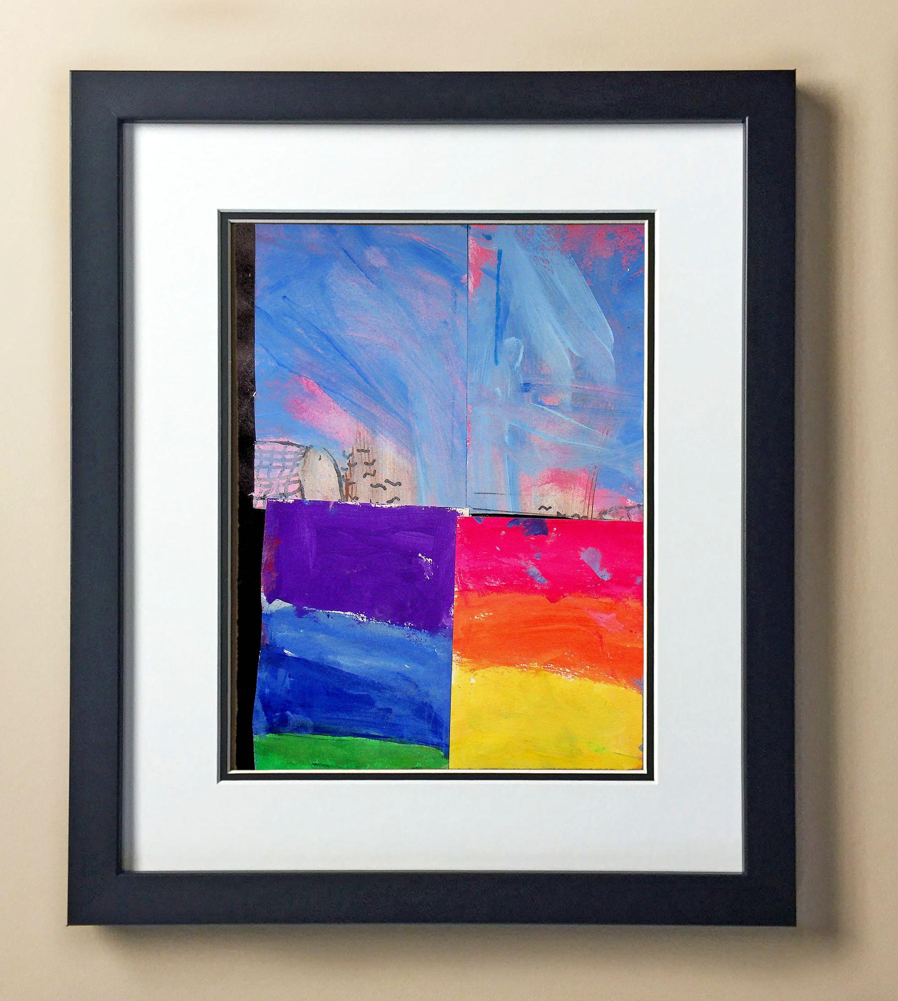 Included with the purchase is the Students Artwork, Frame, double matboard, shatter proof plexiglass, and a ready to hang backerboard with turnbuttons