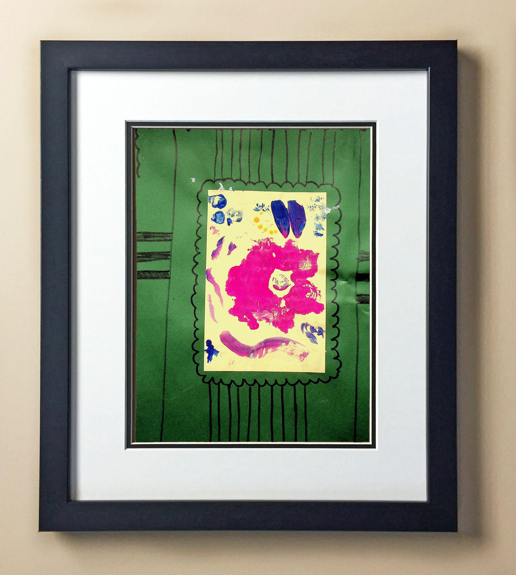 Included with the purchase is the Students Artwork, Frame, double matboard, shatter proof plexiglass, and a ready to hang backerboard with turnbuttons