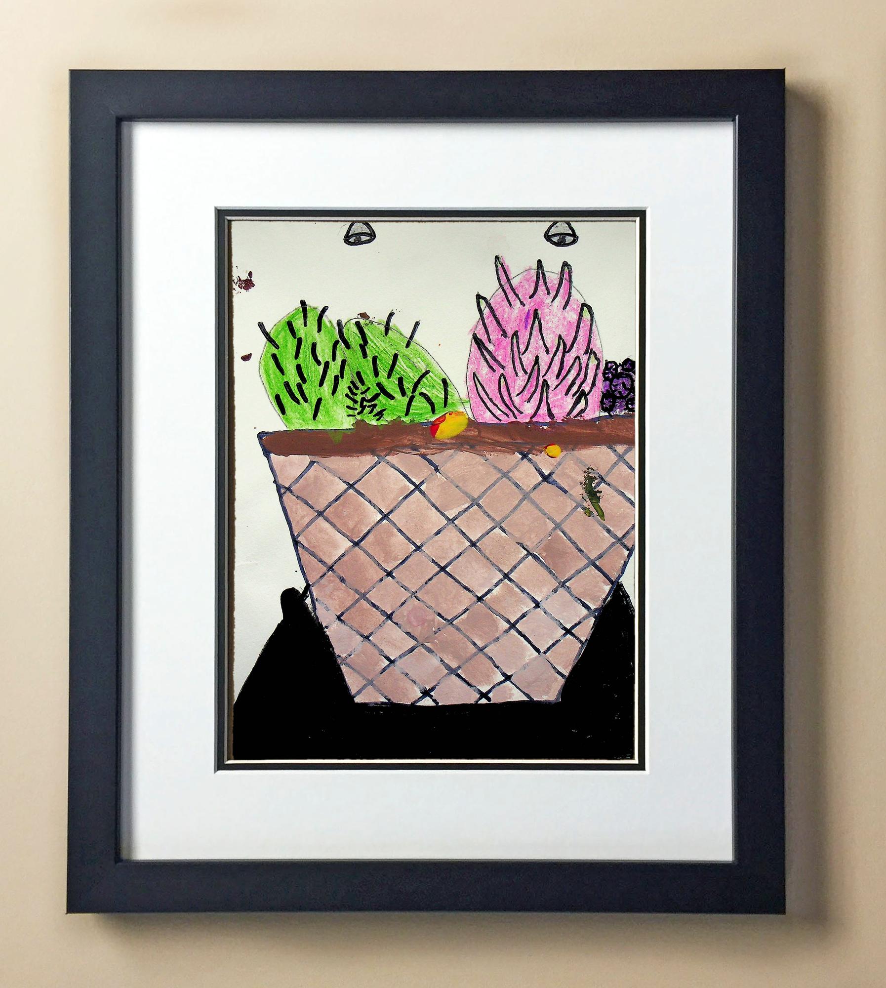 Included with the purchase is the Students Artwork, Frame, double matboard, shatter proof plexiglass, and a ready to hang backerboard with turnbuttons