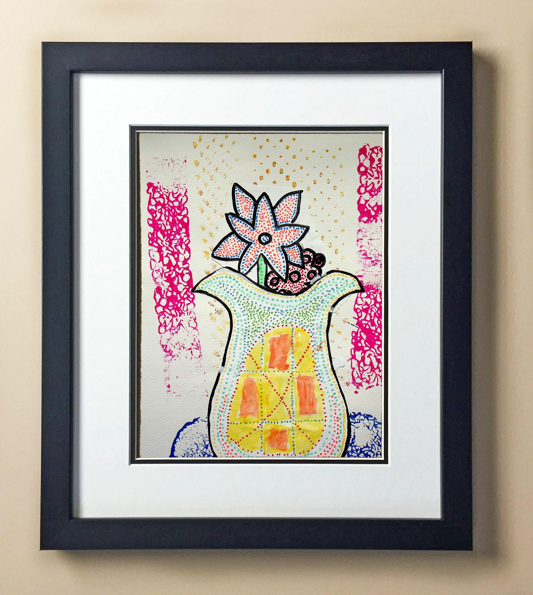 Included with the purchase is the Students Artwork, Frame, double matboard, shatter proof plexiglass, and a ready to hang backerboard with turnbuttons