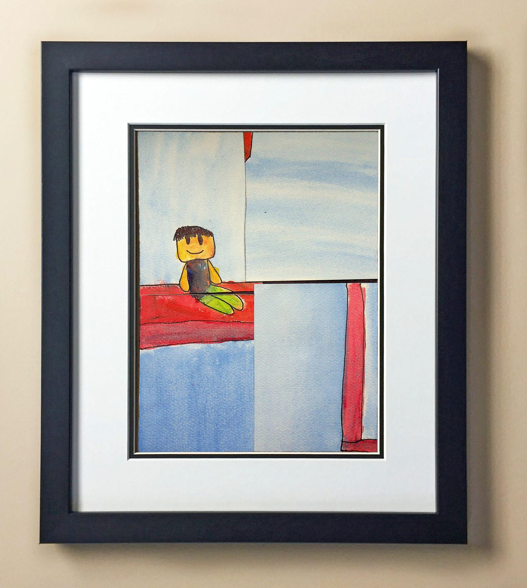 Included with the purchase is the Students Artwork, Frame, double matboard, shatter proof plexiglass, and a ready to hang backerboard with turnbuttons