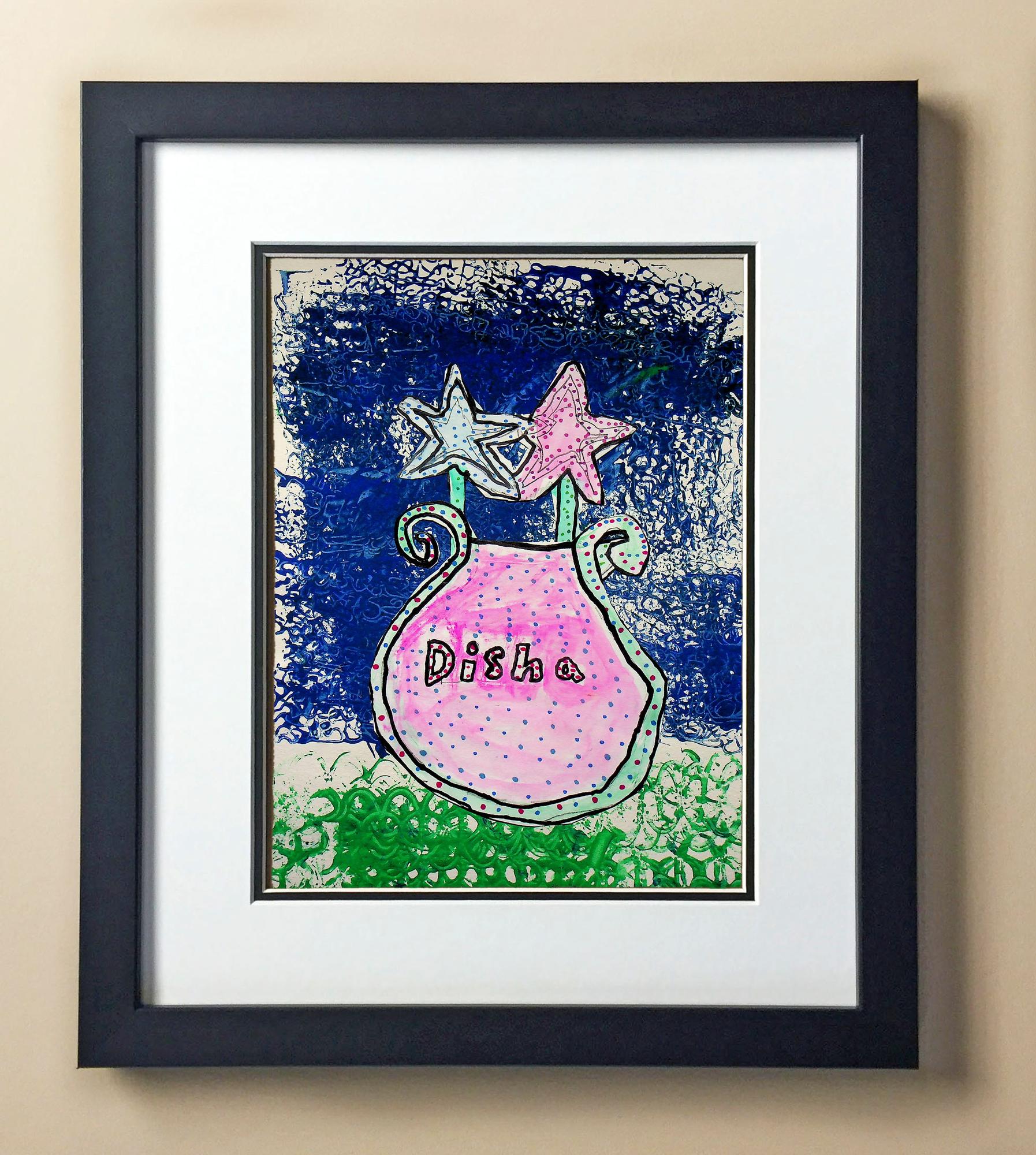 Included with the purchase is the Students Artwork, Frame, double matboard, shatter proof plexiglass, and a ready to hang backerboard with turnbuttons