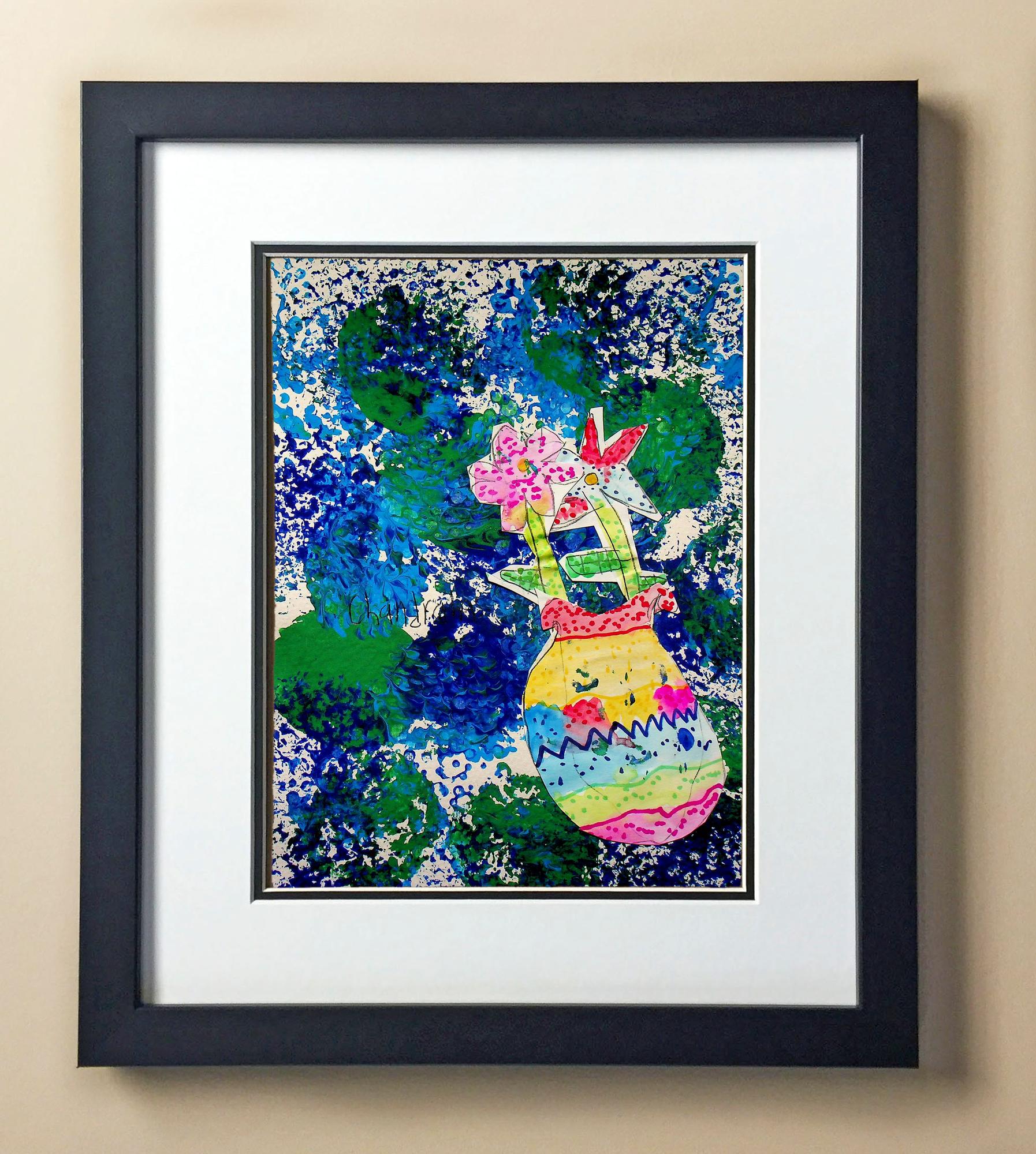 Included with the purchase is the Students Artwork, Frame, double matboard, shatter proof plexiglass, and a ready to hang backerboard with turnbuttons