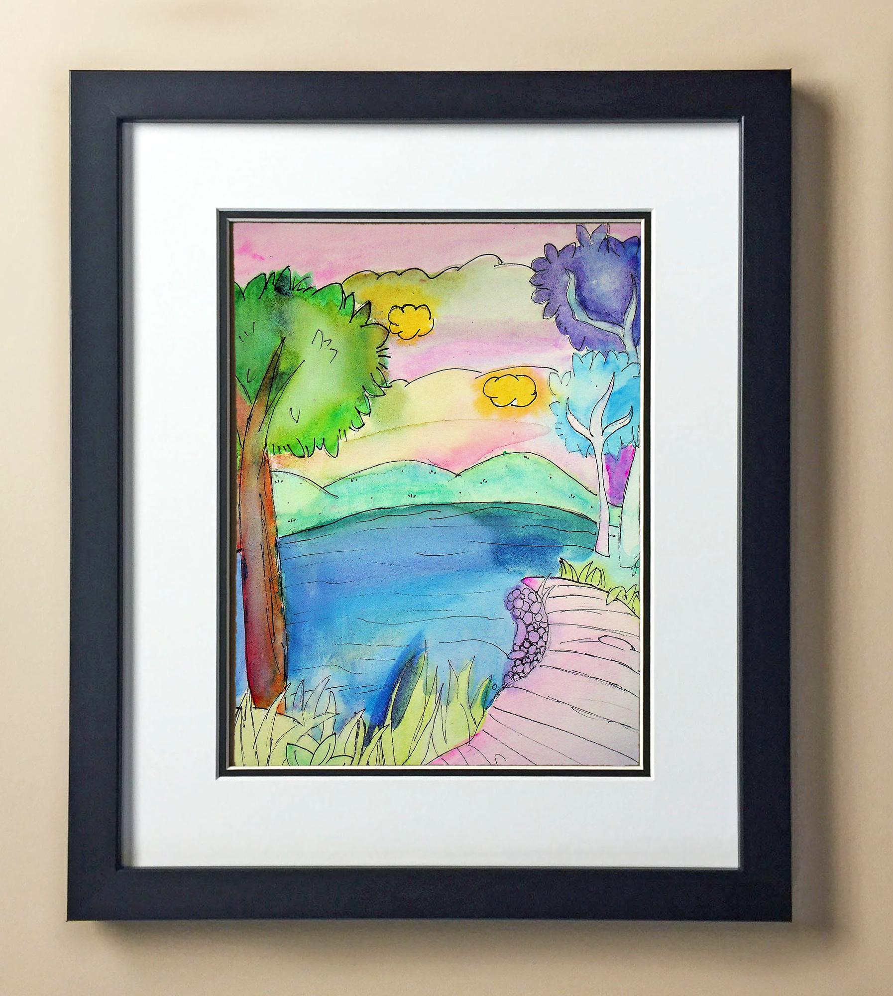 Included with the purchase is the Students Artwork, Frame, double matboard, shatter proof plexiglass, and a ready to hang backerboard with turnbuttons