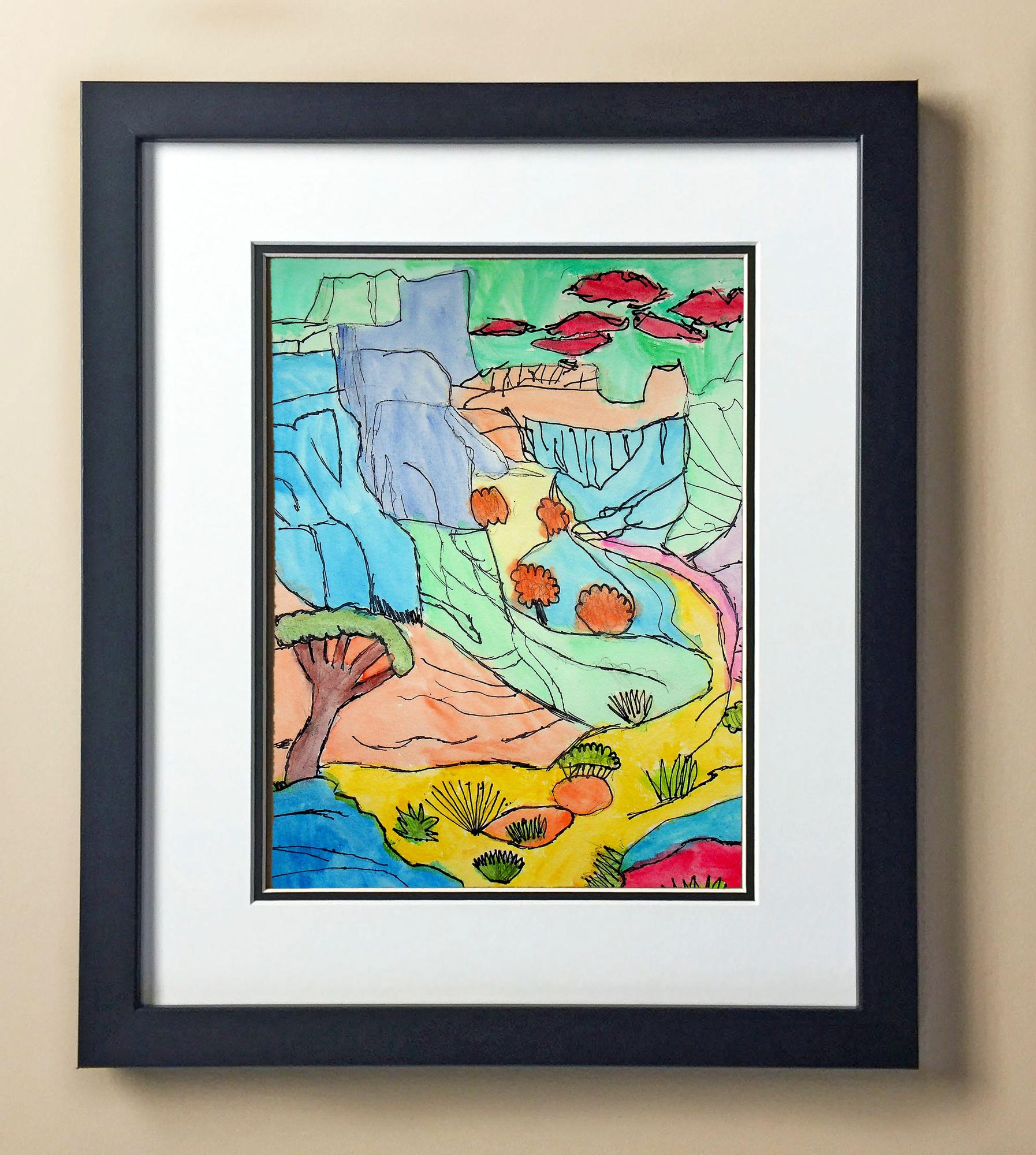 Included with the purchase is the Students Artwork, Frame, double matboard, shatter proof plexiglass, and a ready to hang backerboard with turnbuttons