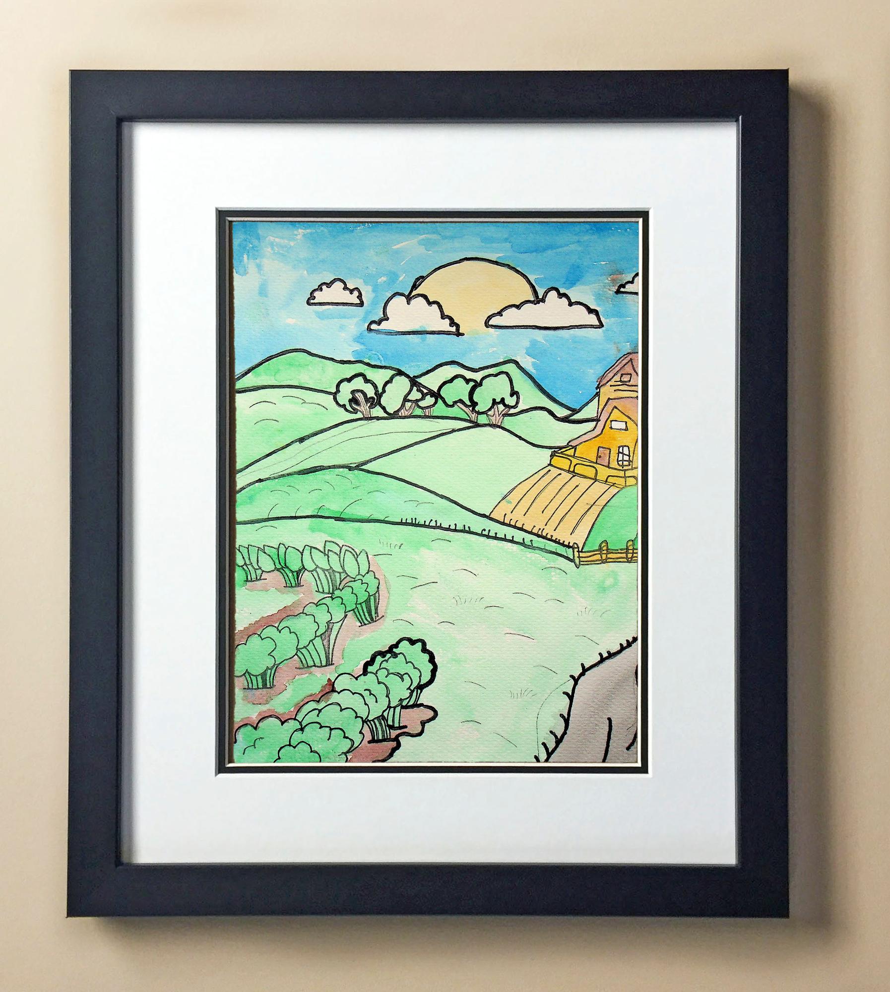 Included with the purchase is the Students Artwork, Frame, double matboard, shatter proof plexiglass, and a ready to hang backerboard with turnbuttons