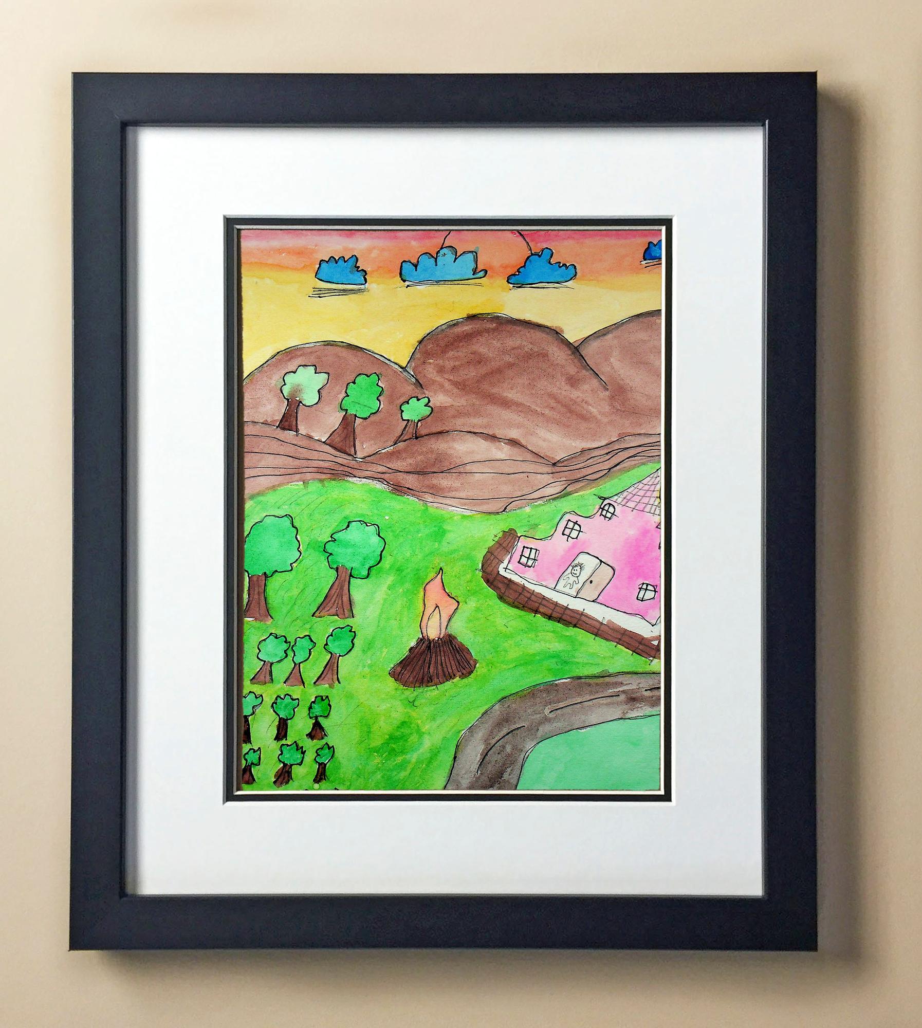 Included with the purchase is the Students Artwork, Frame, double matboard, shatter proof plexiglass, and a ready to hang backerboard with turnbuttons