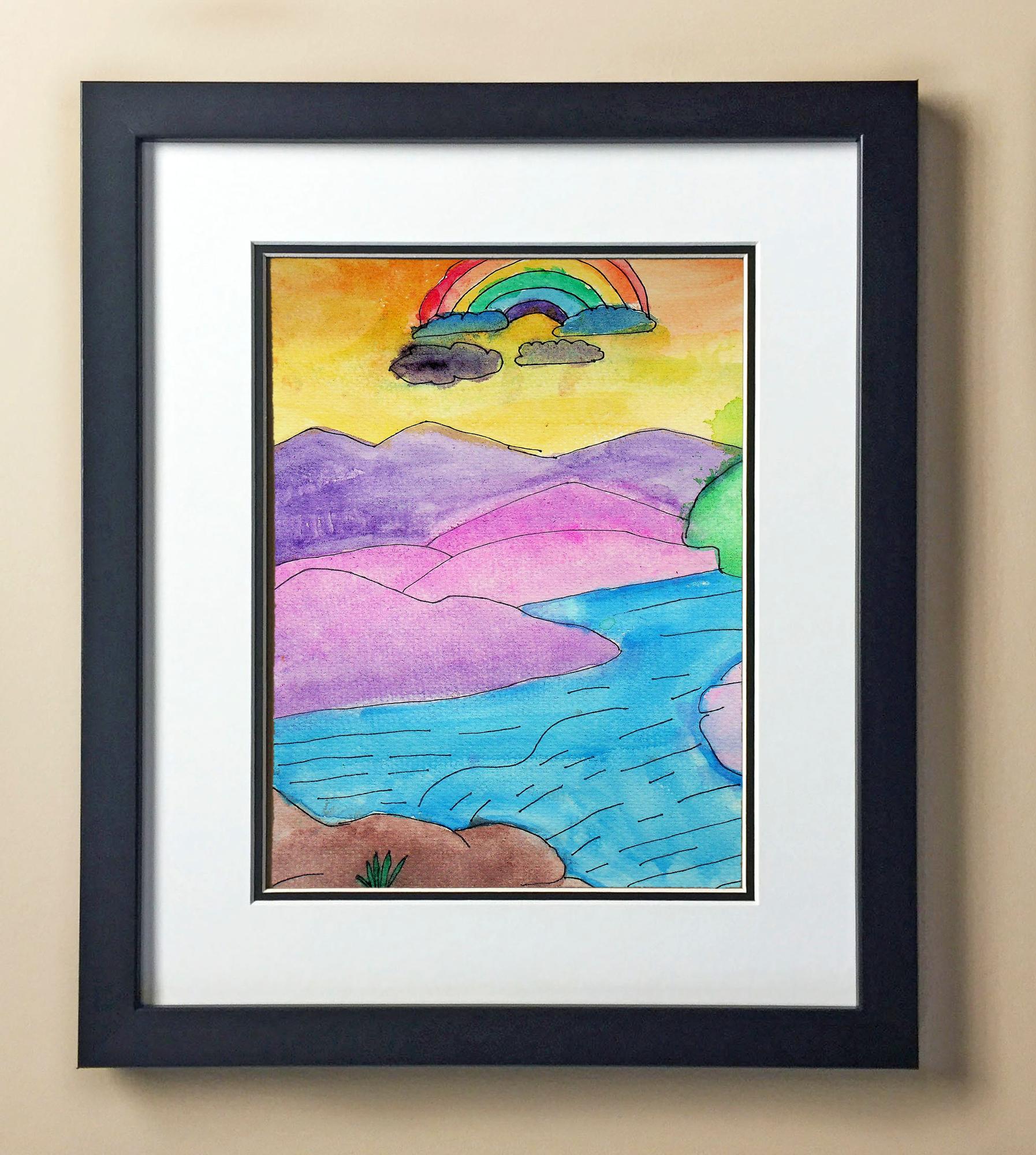 Included with the purchase is the Students Artwork, Frame, double matboard, shatter proof plexiglass, and a ready to hang backerboard with turnbuttons