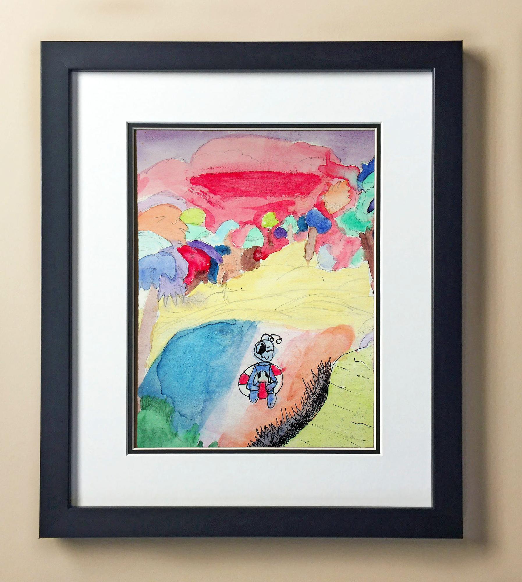 Included with the purchase is the Students Artwork, Frame, double matboard, shatter proof plexiglass, and a ready to hang backerboard with turnbuttons