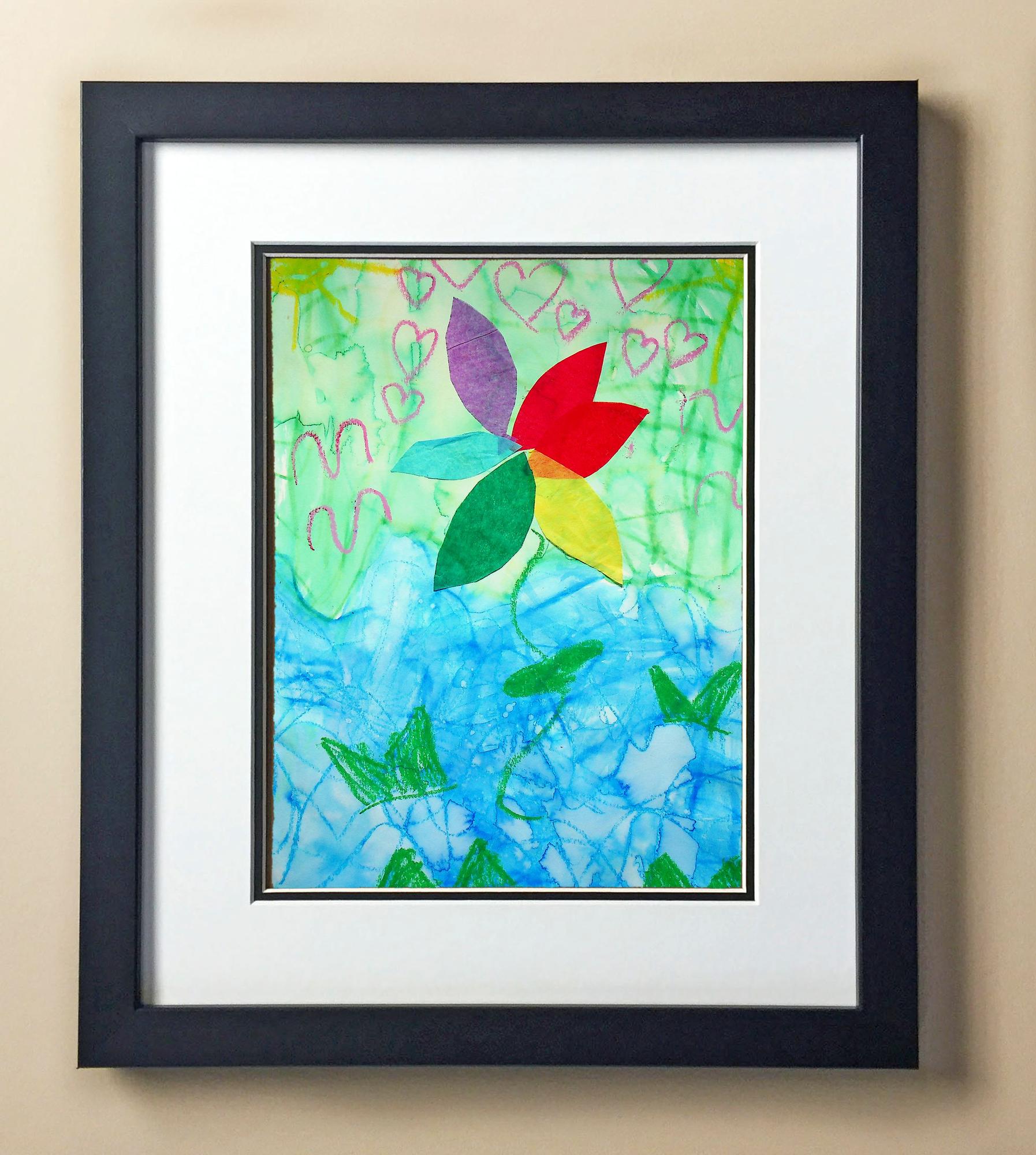 Included with the purchase is the Students Artwork, Frame, double matboard, shatter proof plexiglass, and a ready to hang backerboard with turnbuttons
