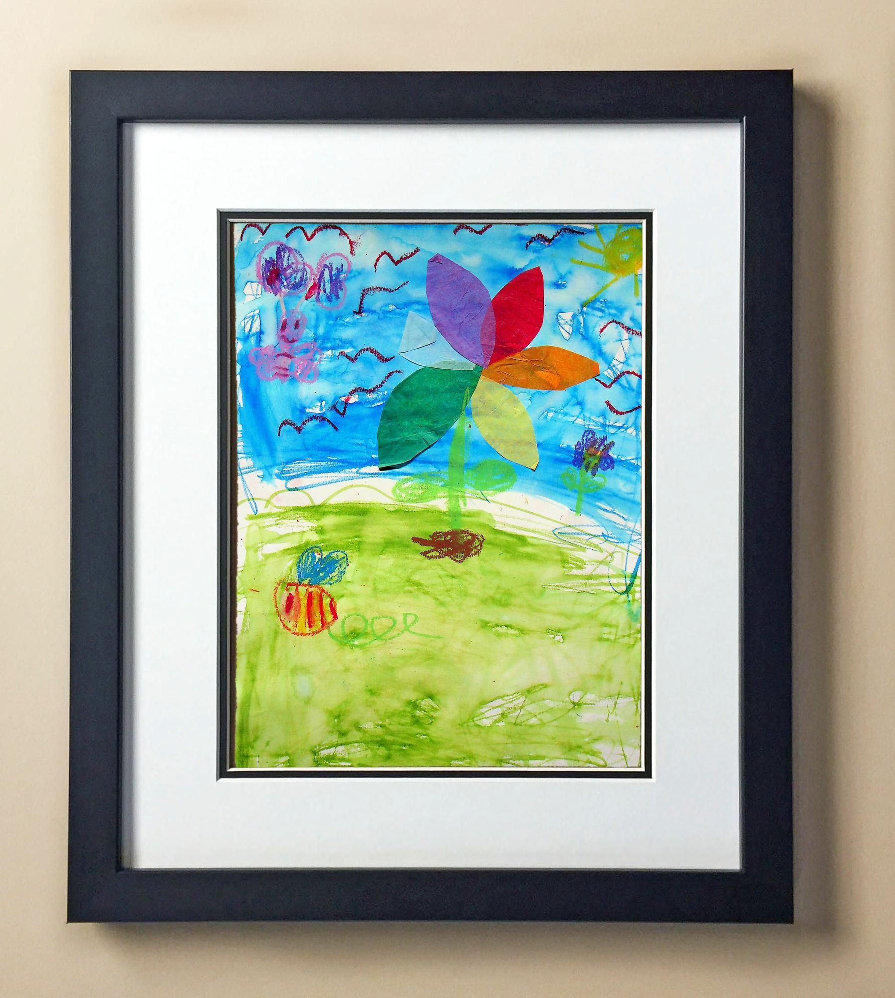 Included with the purchase is the Students Artwork, Frame, double matboard, shatter proof plexiglass, and a ready to hang backerboard with turnbuttons