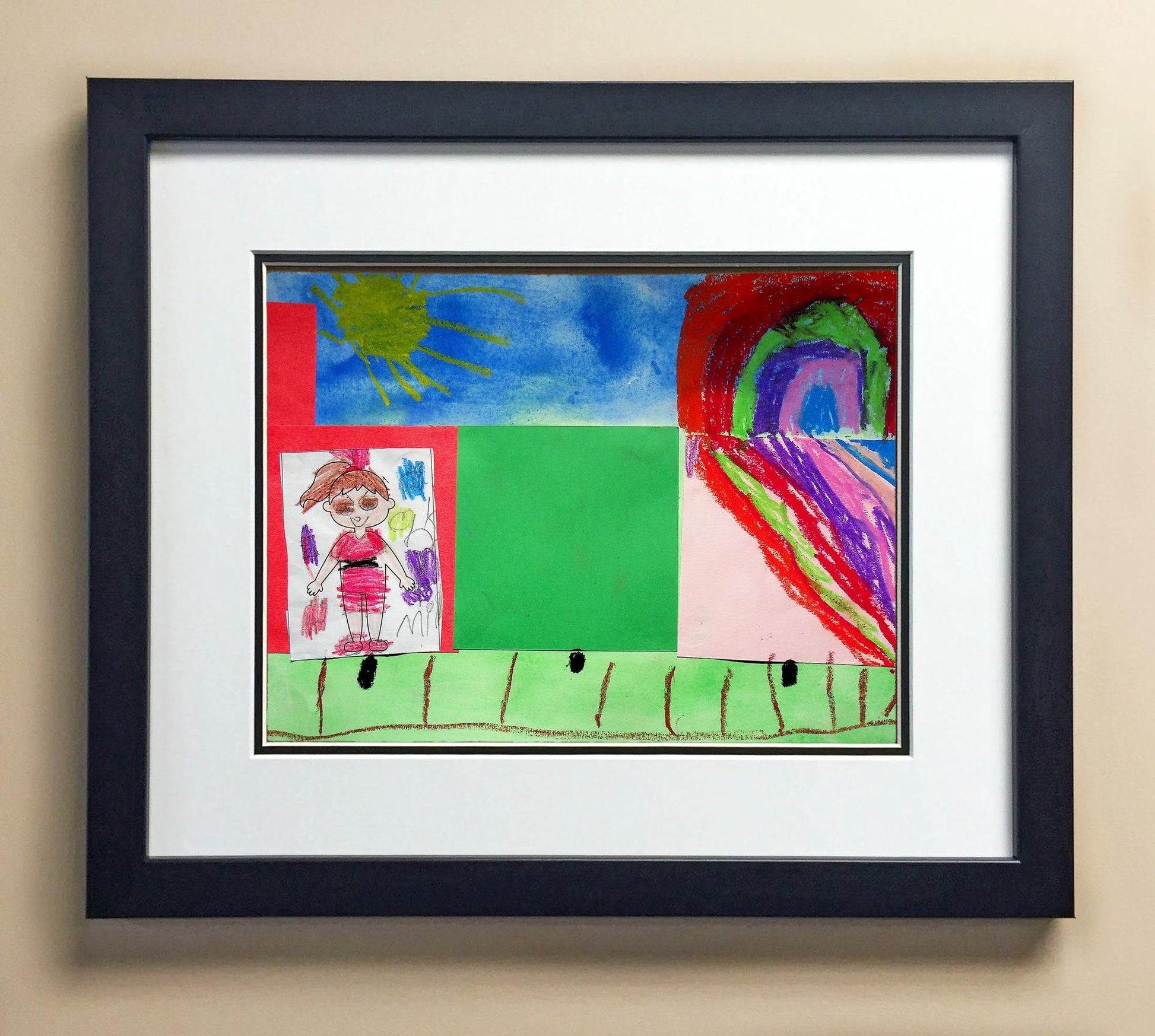 Included with the purchase is the Students Artwork, Frame, double matboard, shatter proof plexiglass, and a ready to hang backerboard with turnbuttons