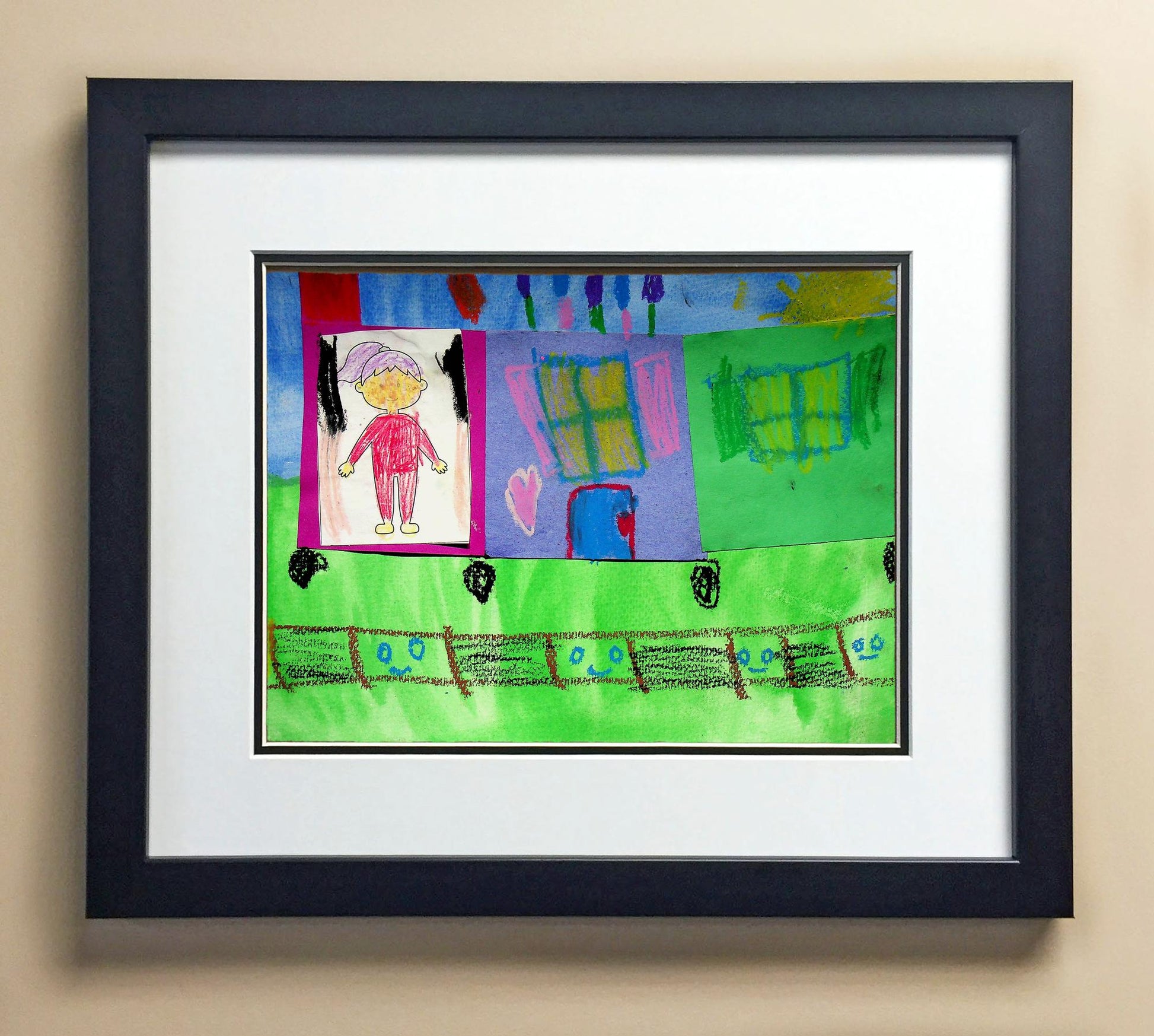 Included with the purchase is the Students Artwork, Frame, double matboard, shatter proof plexiglass, and a ready to hang backerboard with turnbuttons