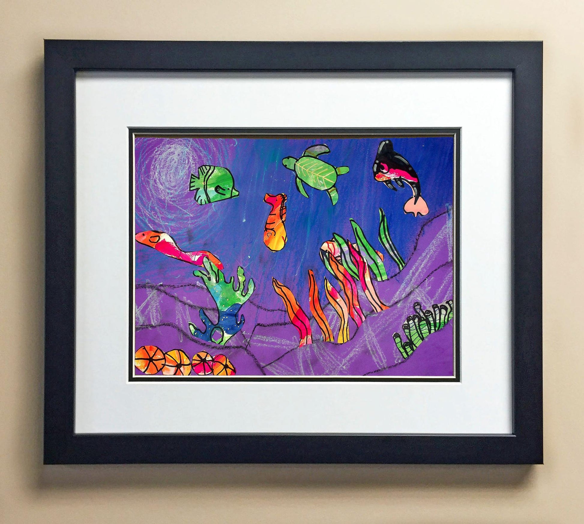 Included with the purchase is the Students Artwork, Frame, double matboard, shatter proof plexiglass, and a ready to hang backerboard with turnbuttons