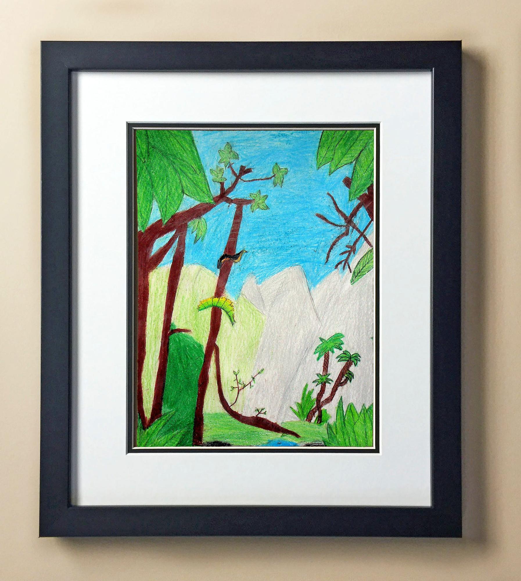 Included with the purchase is the Students Artwork, Frame, double matboard, shatter proof plexiglass, and a ready to hang backerboard with turnbuttons