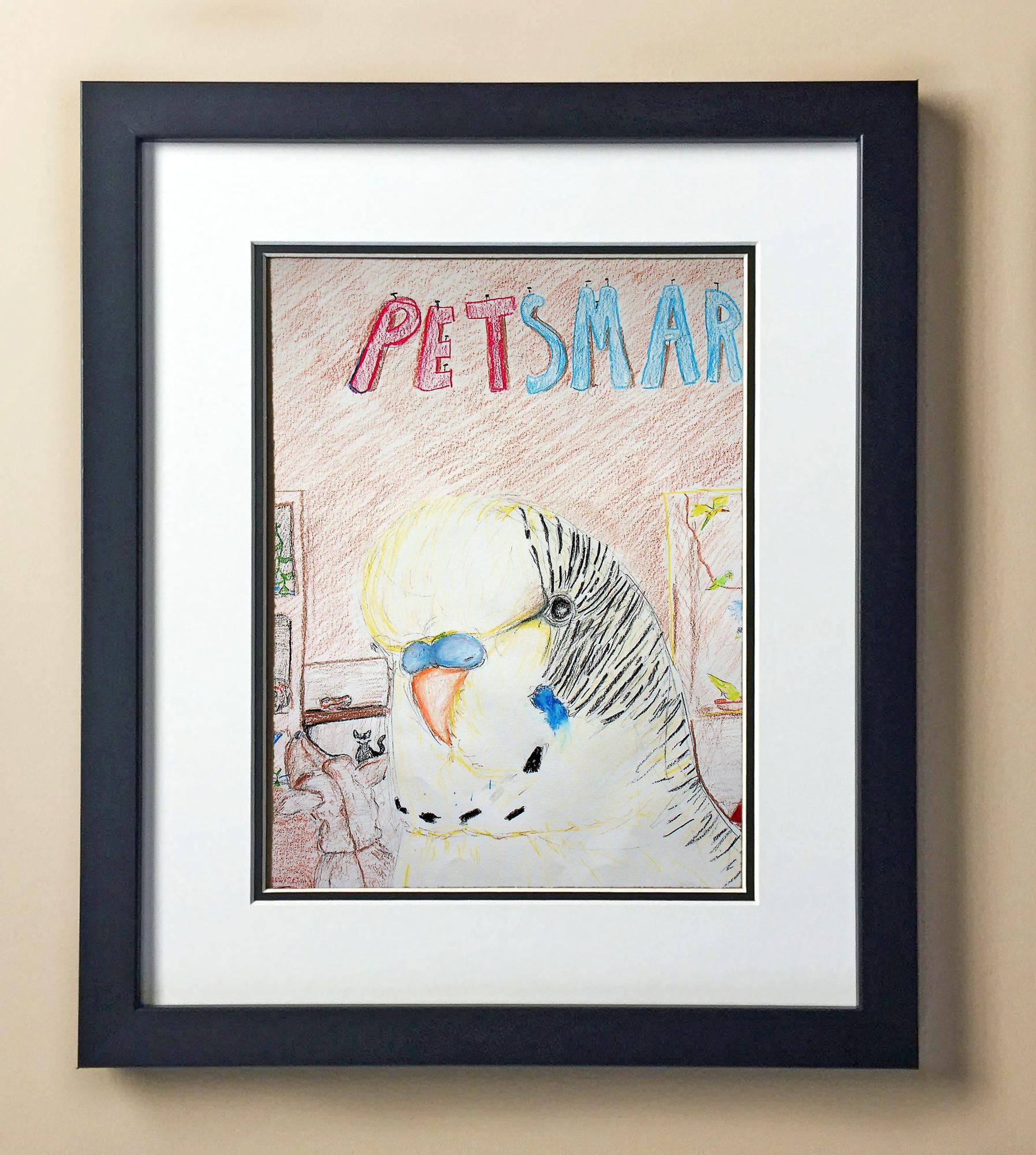 Included with the purchase is the Students Artwork, Frame, double matboard, shatter proof plexiglass, and a ready to hang backerboard with turnbuttons