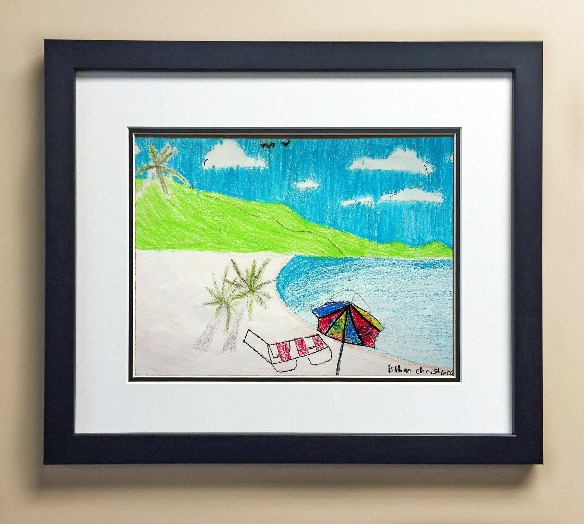 Included with the purchase is the Students Artwork, Frame, double matboard, shatter proof plexiglass, and a ready to hang backerboard with turnbuttons