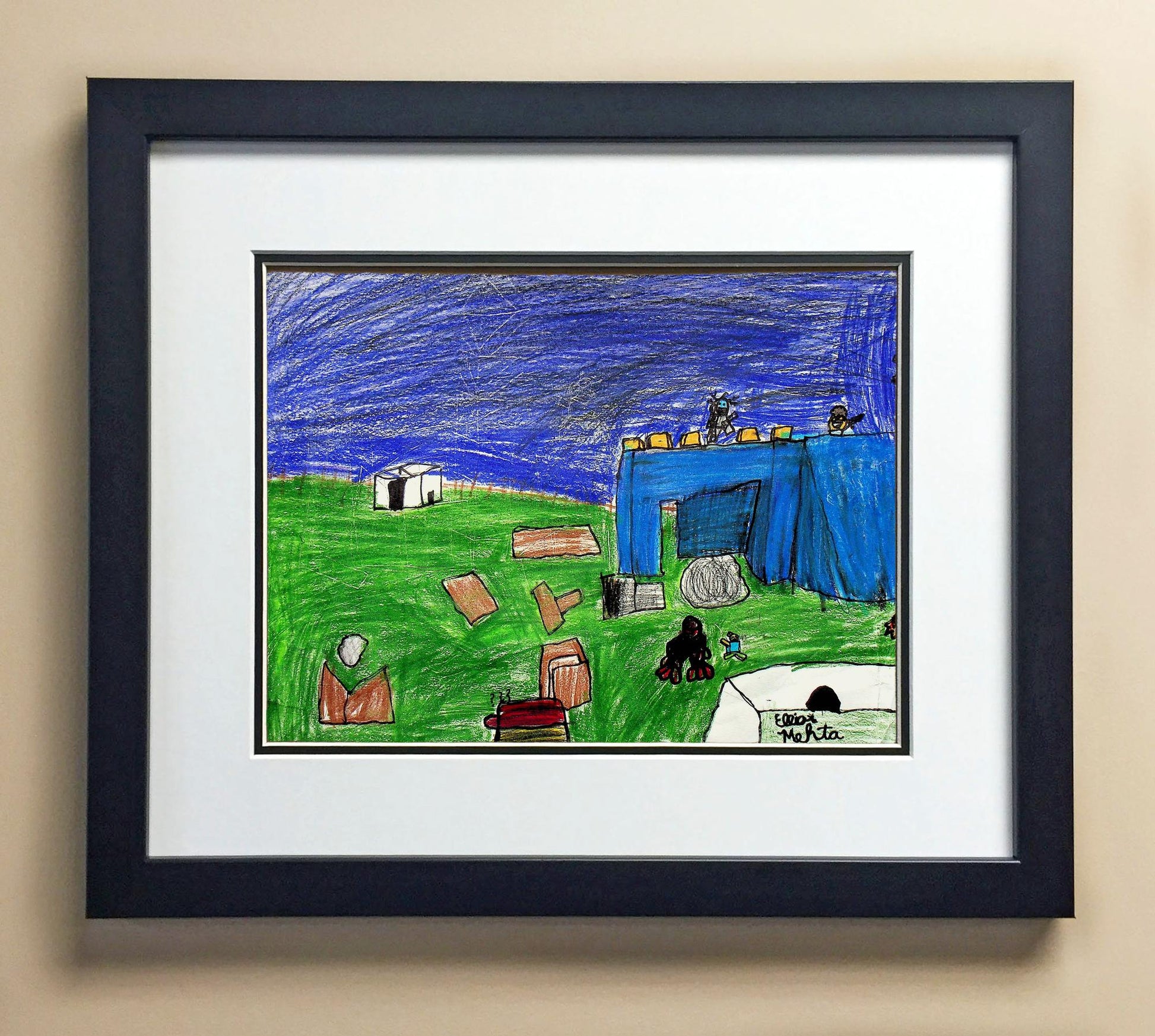 Included with the purchase is the Students Artwork, Frame, double matboard, shatter proof plexiglass, and a ready to hang backerboard with turnbuttons