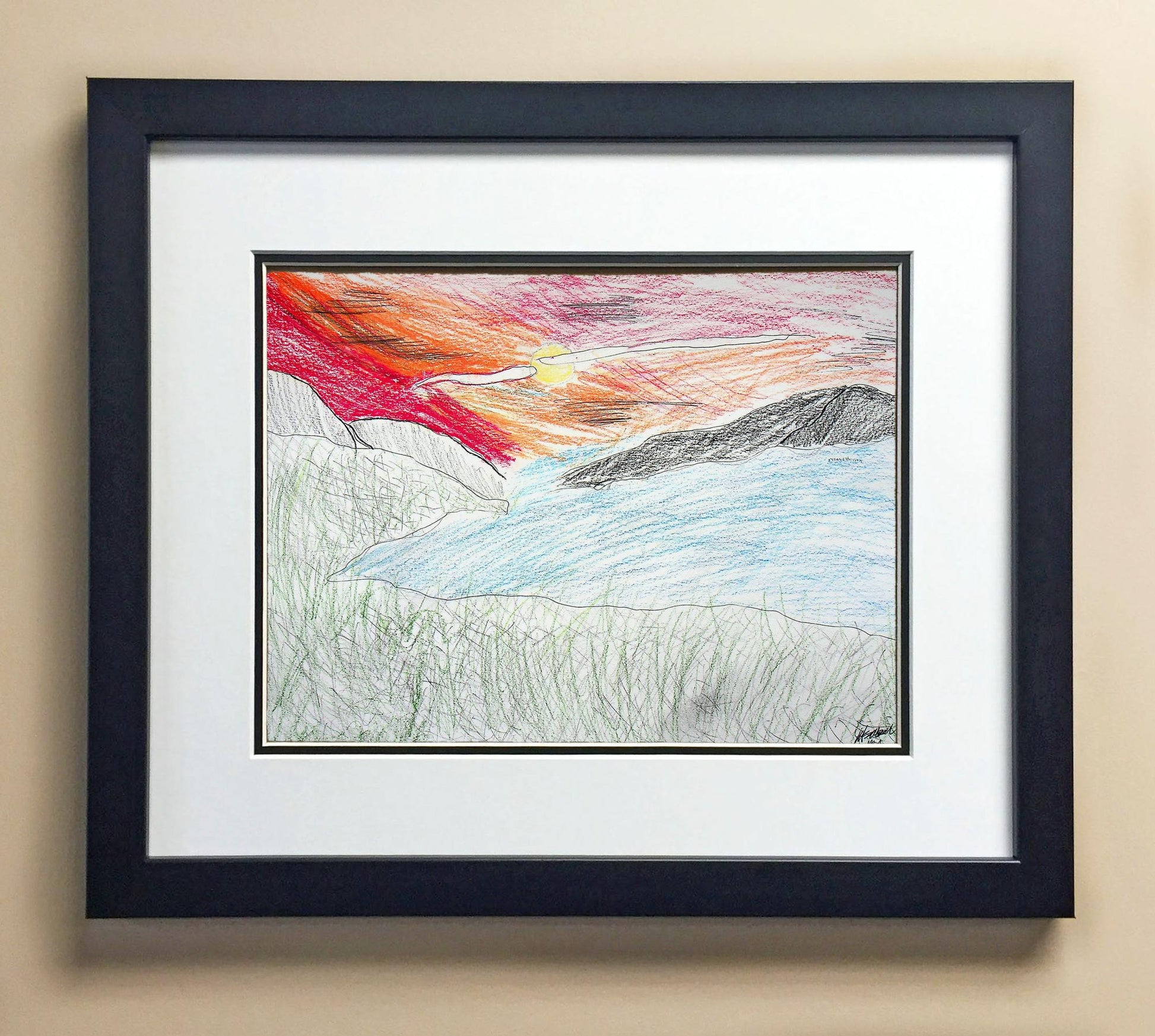 Included with the purchase is the Students Artwork, Frame, double matboard, shatter proof plexiglass, and a ready to hang backerboard with turnbuttons