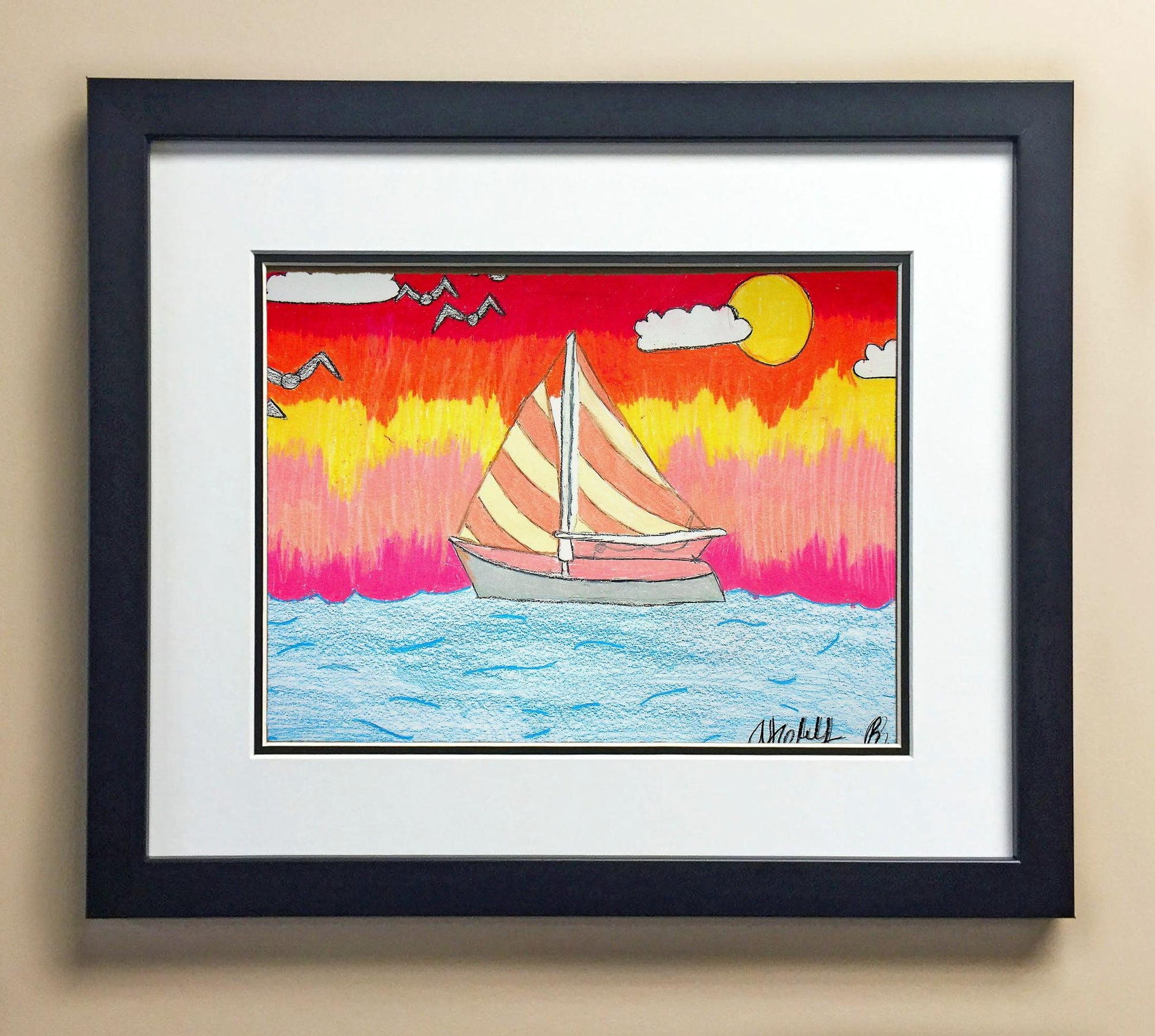 Included with the purchase is the Students Artwork, Frame, double matboard, shatter proof plexiglass, and a ready to hang backerboard with turnbuttons