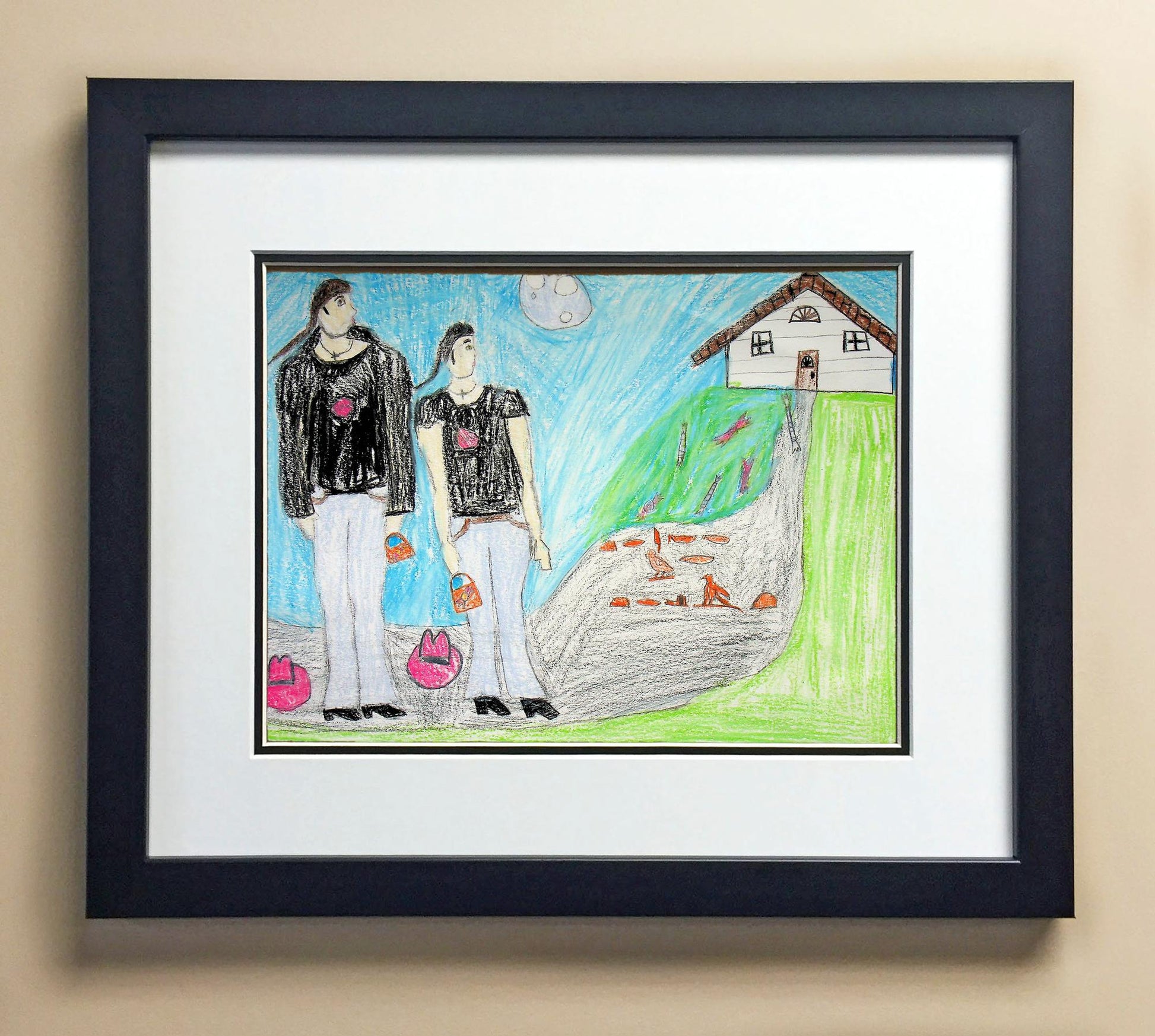 Included with the purchase is the Students Artwork, Frame, double matboard, shatter proof plexiglass, and a ready to hang backerboard with turnbuttons