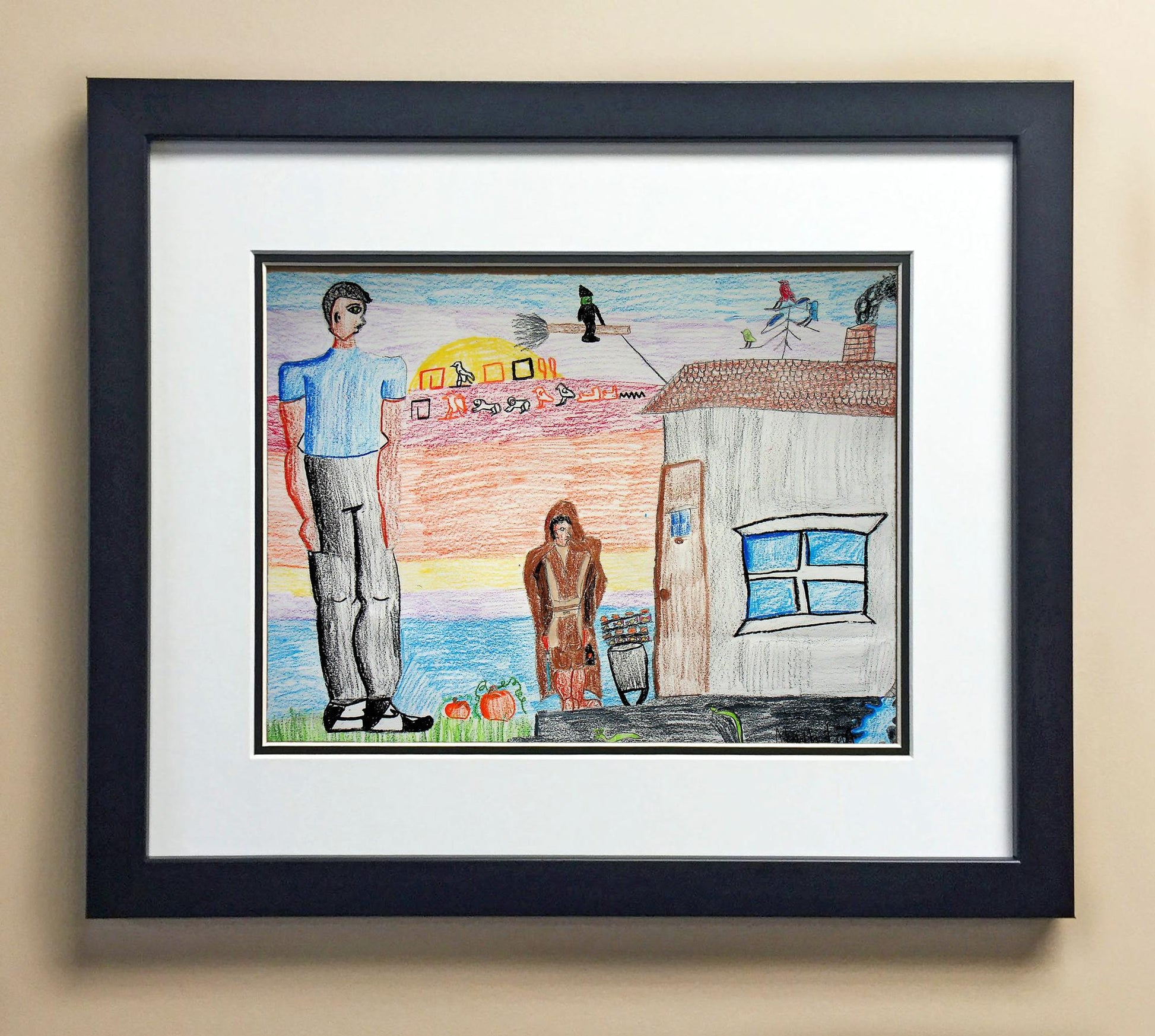 Included with the purchase is the Students Artwork, Frame, double matboard, shatter proof plexiglass, and a ready to hang backerboard with turnbuttons