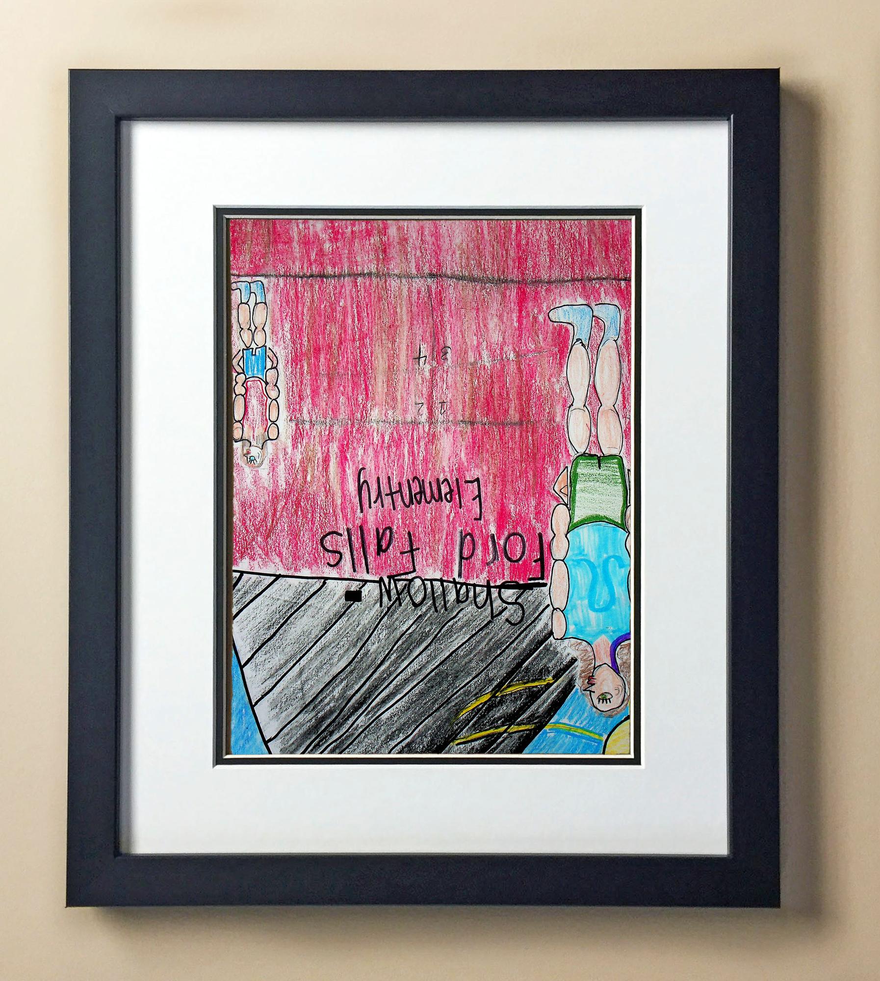 Included with the purchase is the Students Artwork, Frame, double matboard, shatter proof plexiglass, and a ready to hang backerboard with turnbuttons