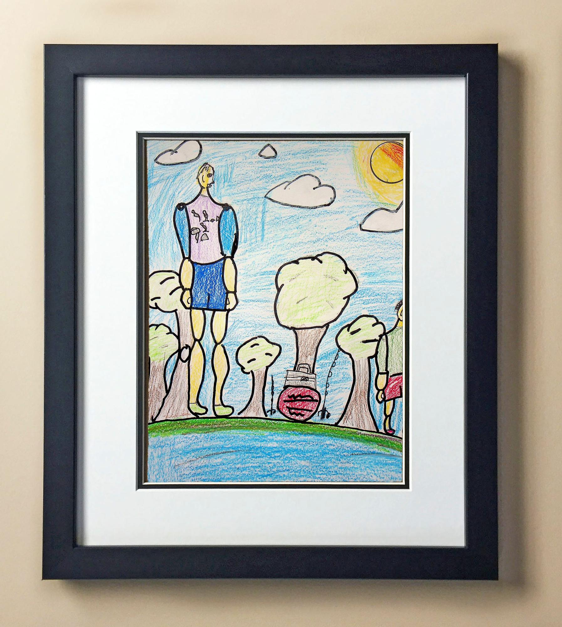 Included with the purchase is the Students Artwork, Frame, double matboard, shatter proof plexiglass, and a ready to hang backerboard with turnbuttons
