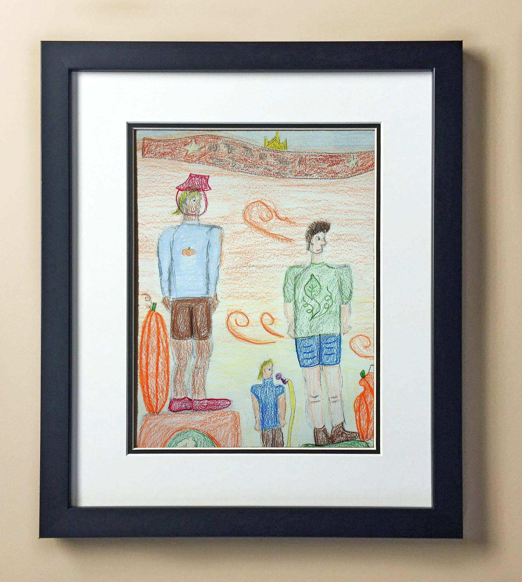 Included with the purchase is the Students Artwork, Frame, double matboard, shatter proof plexiglass, and a ready to hang backerboard with turnbuttons