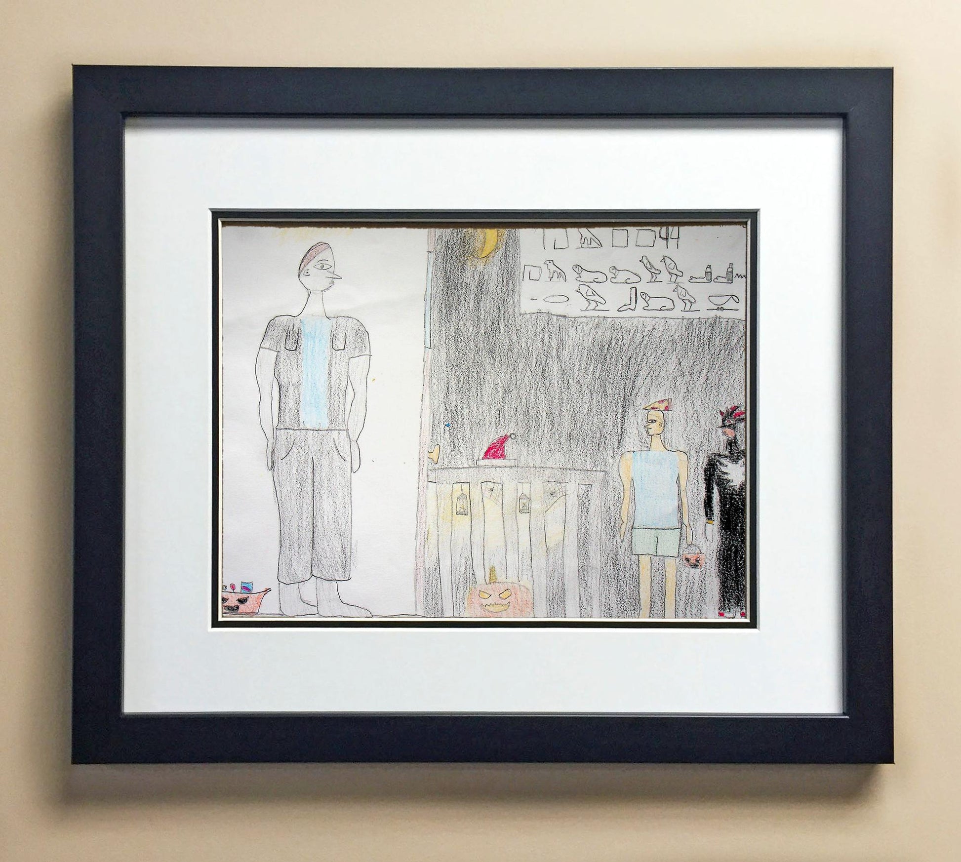 Included with the purchase is the Students Artwork, Frame, double matboard, shatter proof plexiglass, and a ready to hang backerboard with turnbuttons