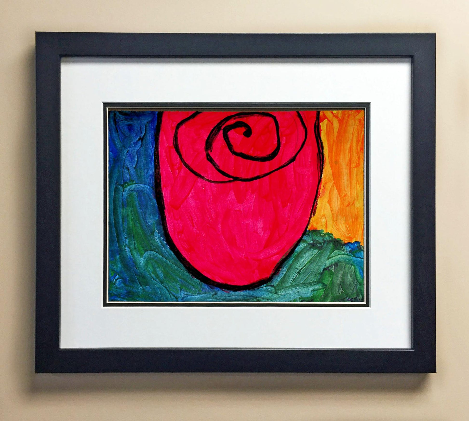 Included with the purchase is the Students Artwork, Frame, double matboard, shatter proof plexiglass, and a ready to hang backerboard with turnbuttons
