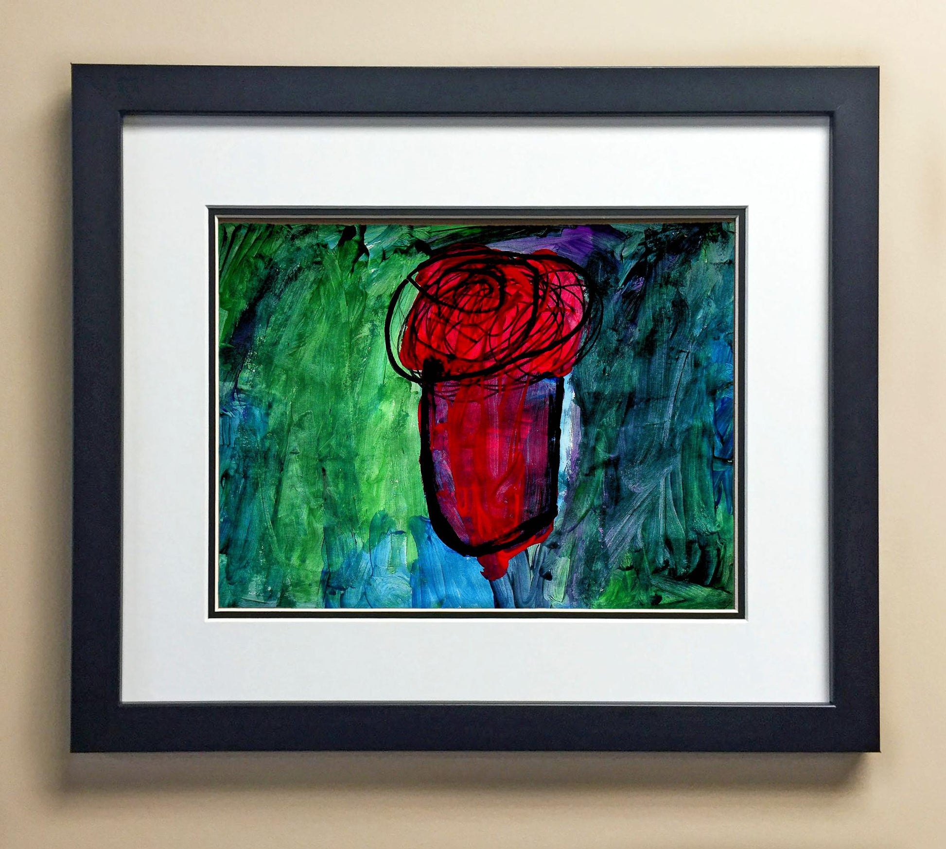 Included with the purchase is the Students Artwork, Frame, double matboard, shatter proof plexiglass, and a ready to hang backerboard with turnbuttons