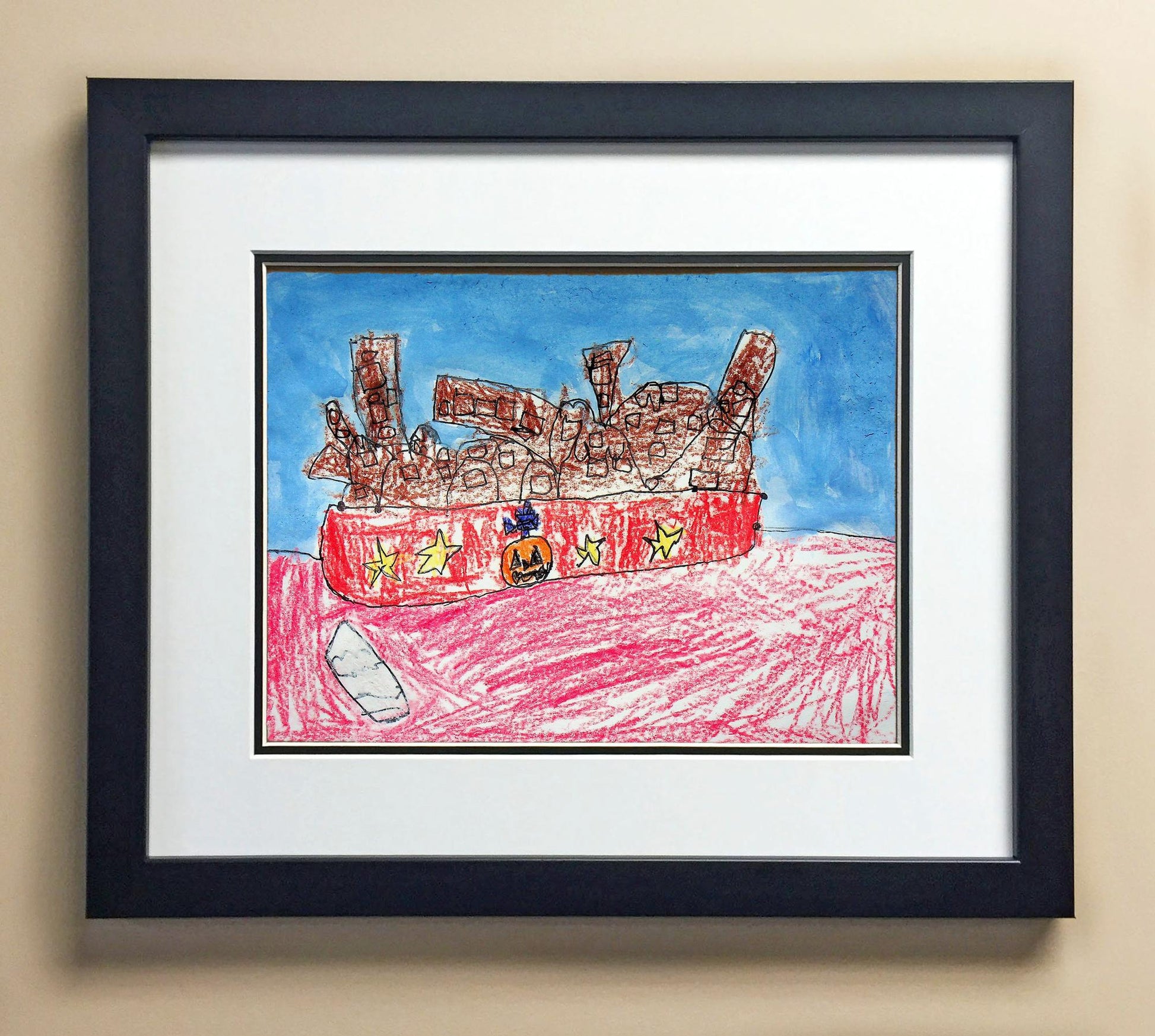 Included with the purchase is the Students Artwork, Frame, double matboard, shatter proof plexiglass, and a ready to hang backerboard with turnbuttons