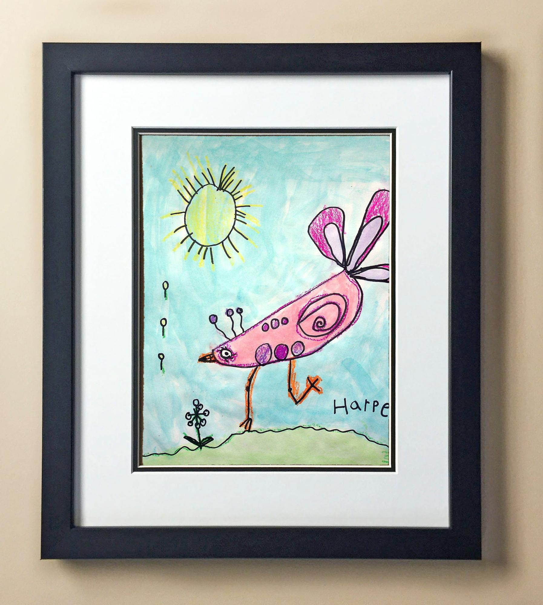 Included with the purchase is the Students Artwork, Frame, double matboard, shatter proof plexiglass, and a ready to hang backerboard with turnbuttons