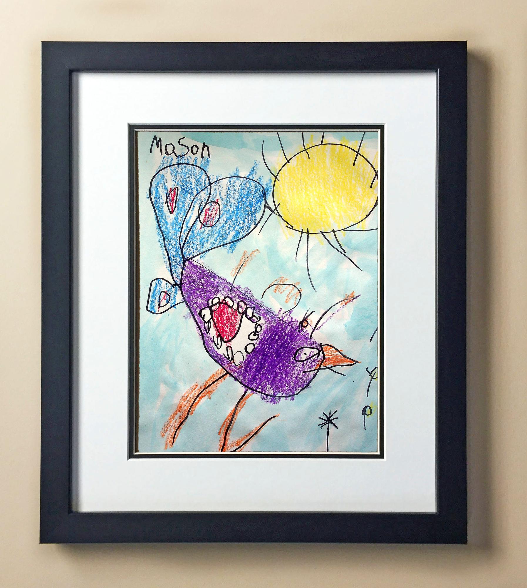Included with the purchase is the Students Artwork, Frame, double matboard, shatter proof plexiglass, and a ready to hang backerboard with turnbuttons