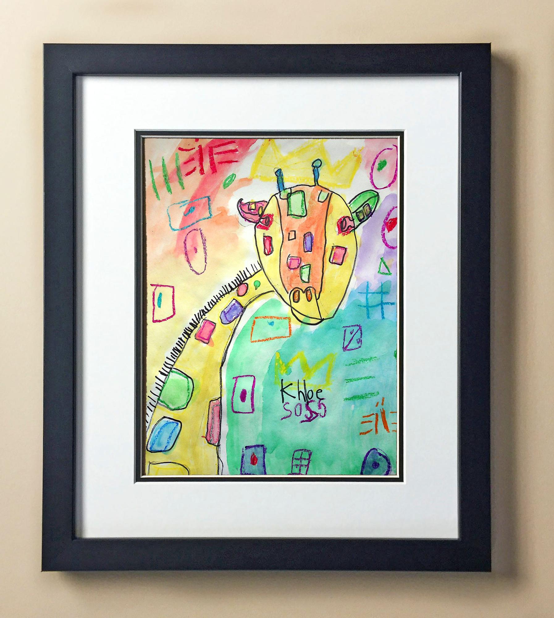 Included with the purchase is the Students Artwork, Frame, double matboard, shatter proof plexiglass, and a ready to hang backerboard with turnbuttons