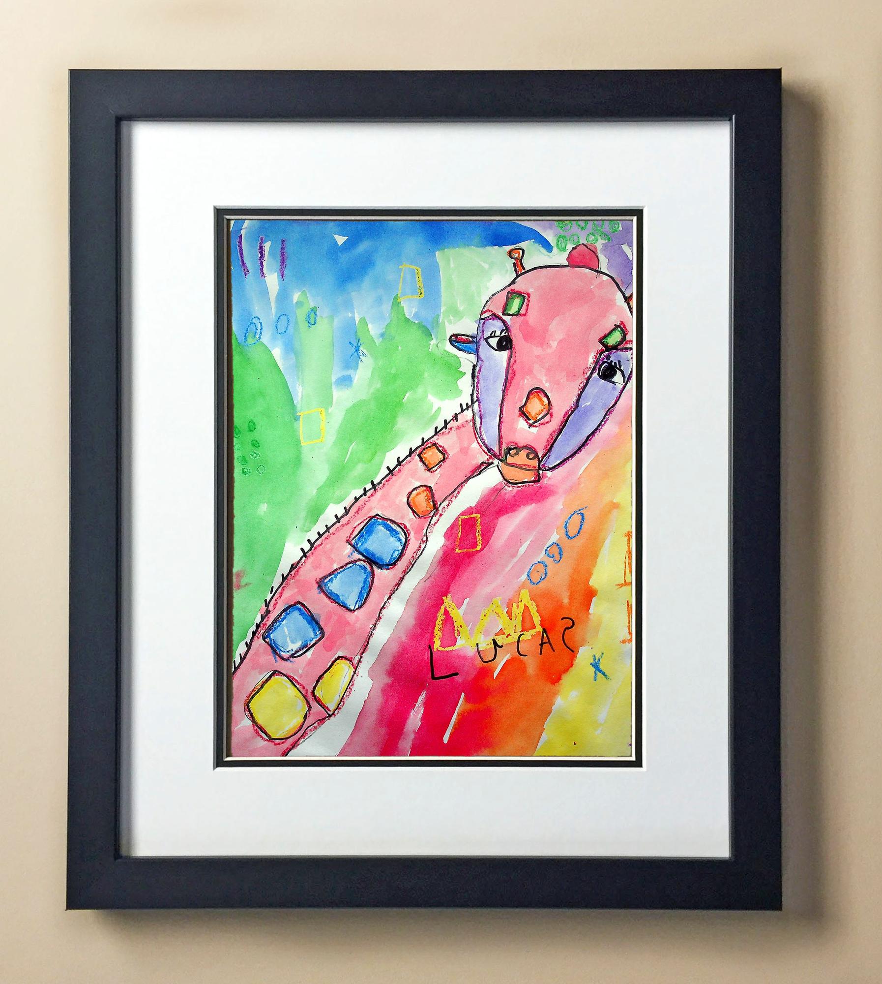 Included with the purchase is the Students Artwork, Frame, double matboard, shatter proof plexiglass, and a ready to hang backerboard with turnbuttons