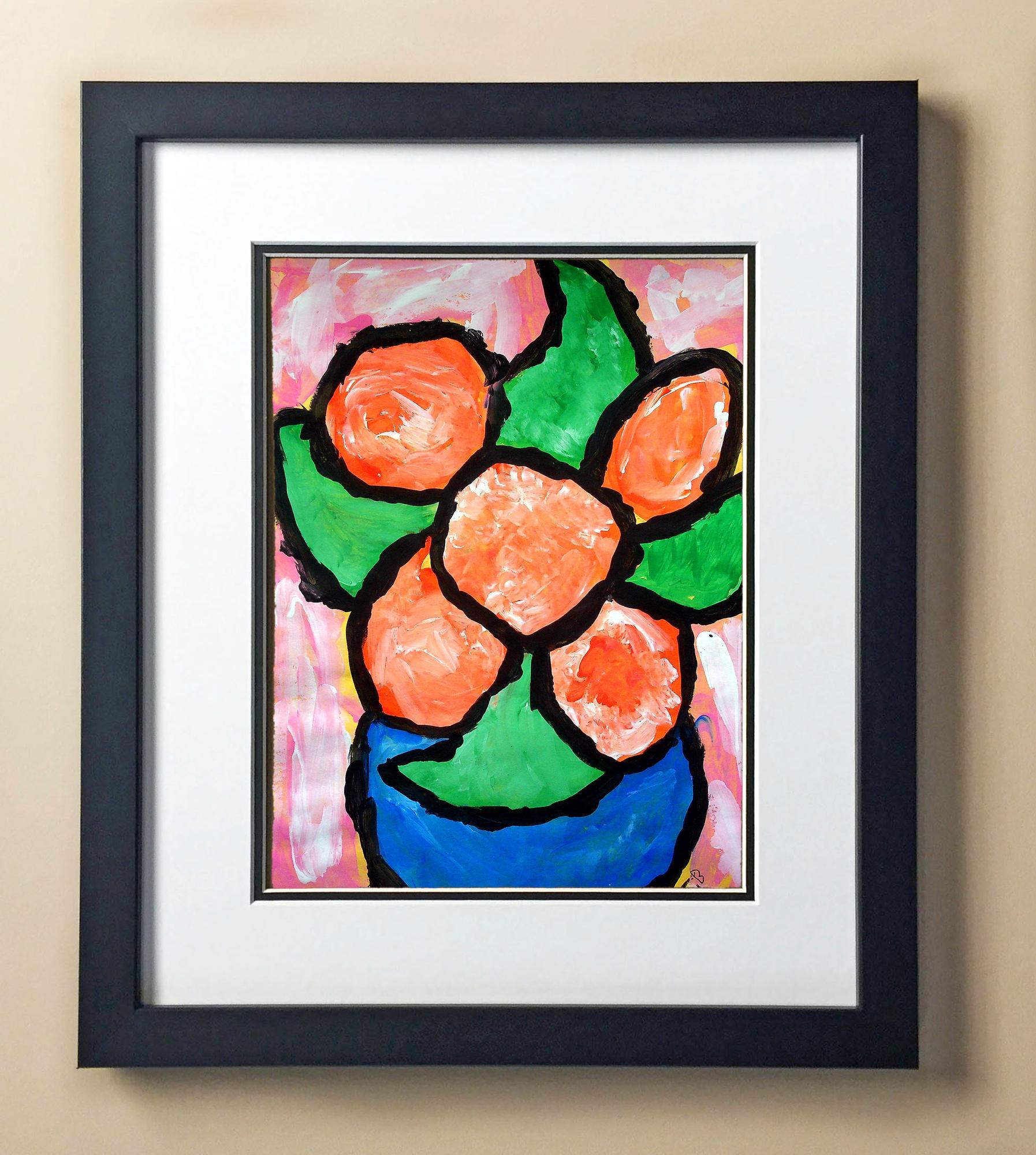 Included with the purchase is the Students Artwork, Frame, double matboard, shatter proof plexiglass, and a ready to hang backerboard with turnbuttons