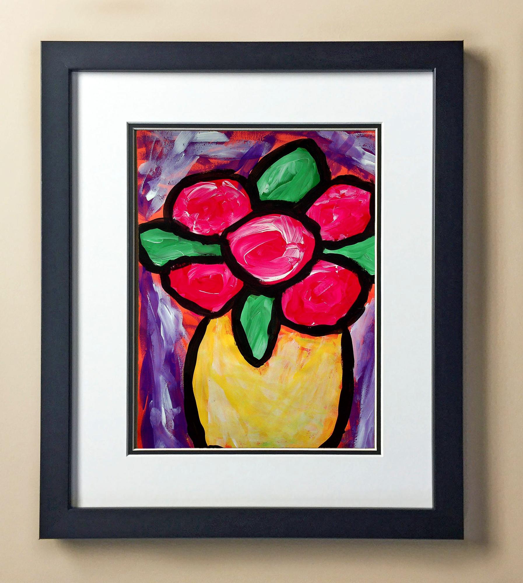 Included with the purchase is the Students Artwork, Frame, double matboard, shatter proof plexiglass, and a ready to hang backerboard with turnbuttons