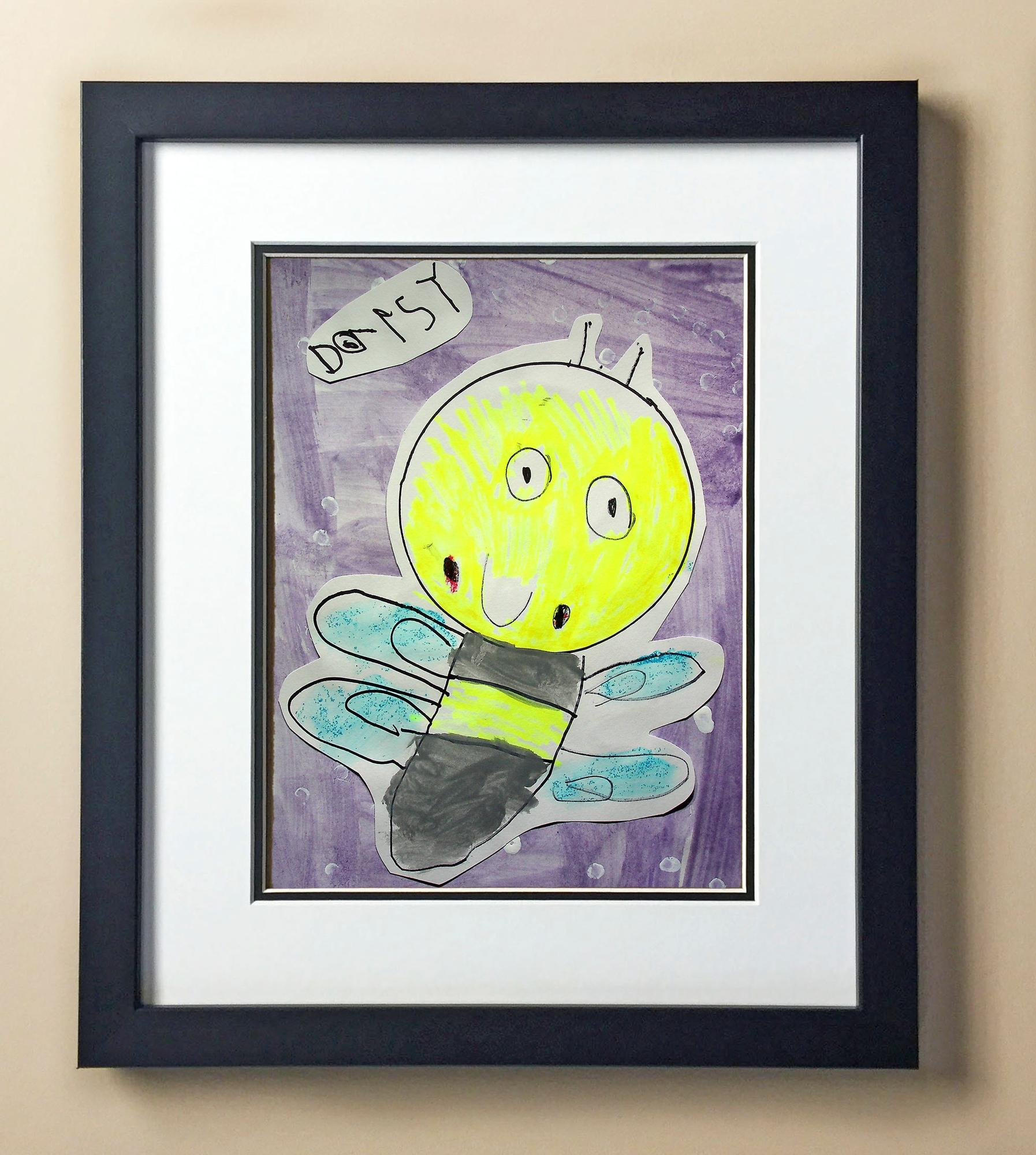 Included with the purchase is the Students Artwork, Frame, double matboard, shatter proof plexiglass, and a ready to hang backerboard with turnbuttons