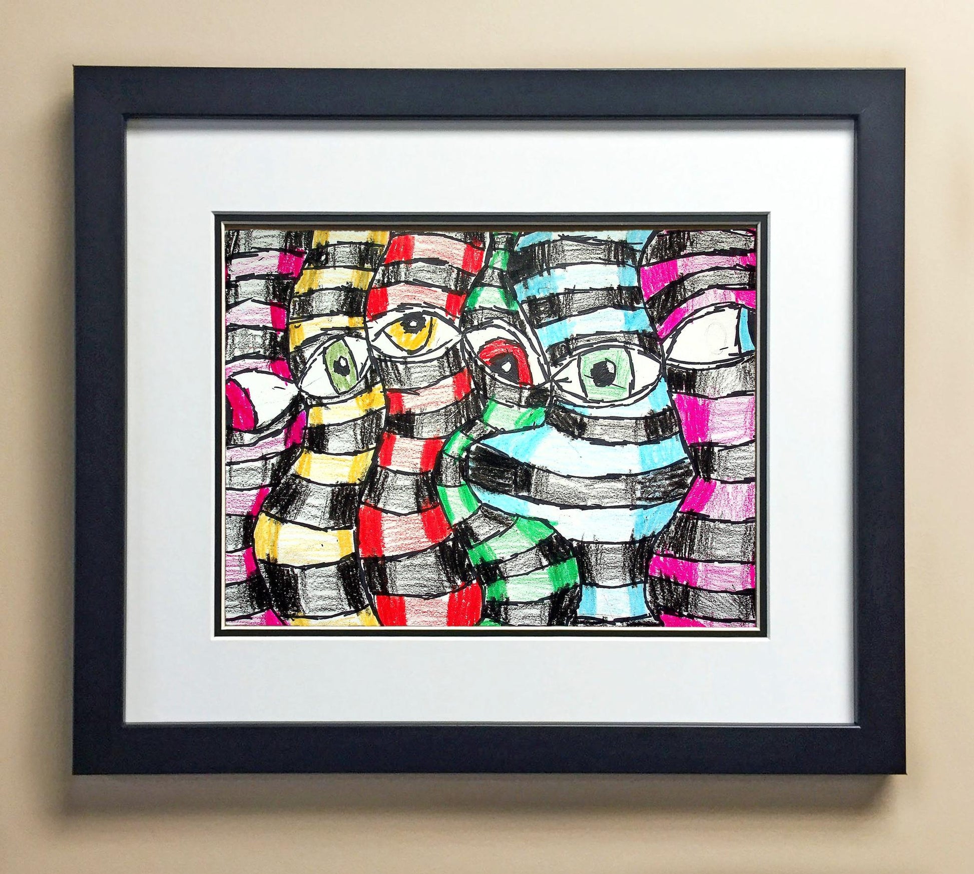 Included with the purchase is the Students Artwork, Frame, double matboard, shatter proof plexiglass, and a ready to hang backerboard with turnbuttons
