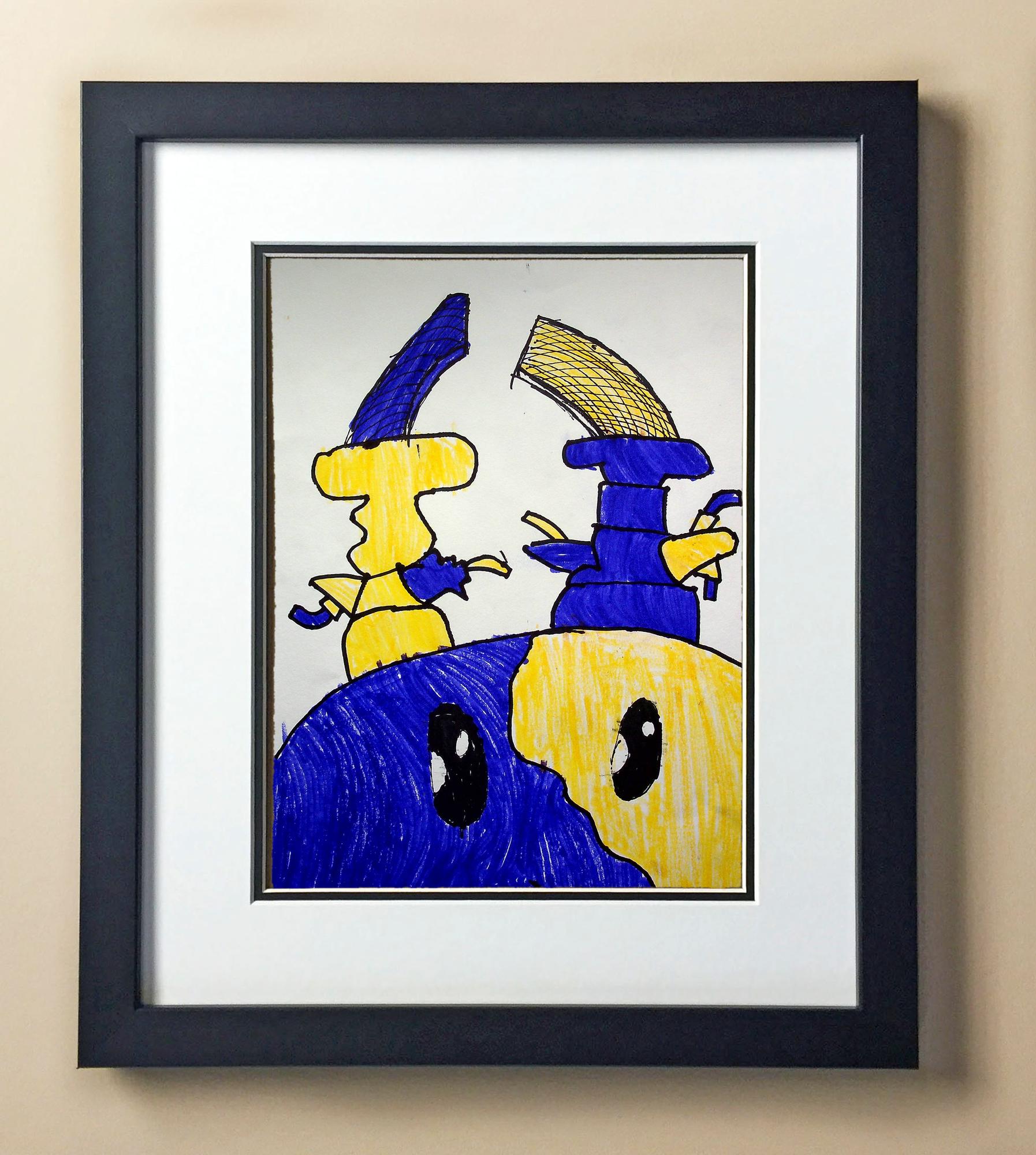 Included with the purchase is the Students Artwork, Frame, double matboard, shatter proof plexiglass, and a ready to hang backerboard with turnbuttons