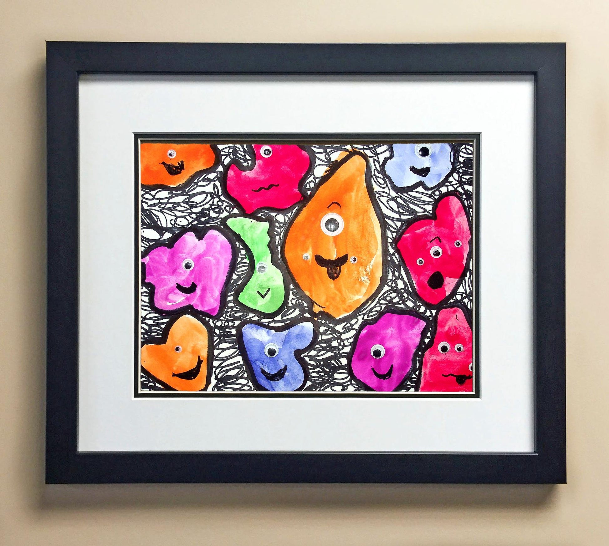 Included with the purchase is the Students Artwork, Frame, double matboard, shatter proof plexiglass, and a ready to hang backerboard with turnbuttons