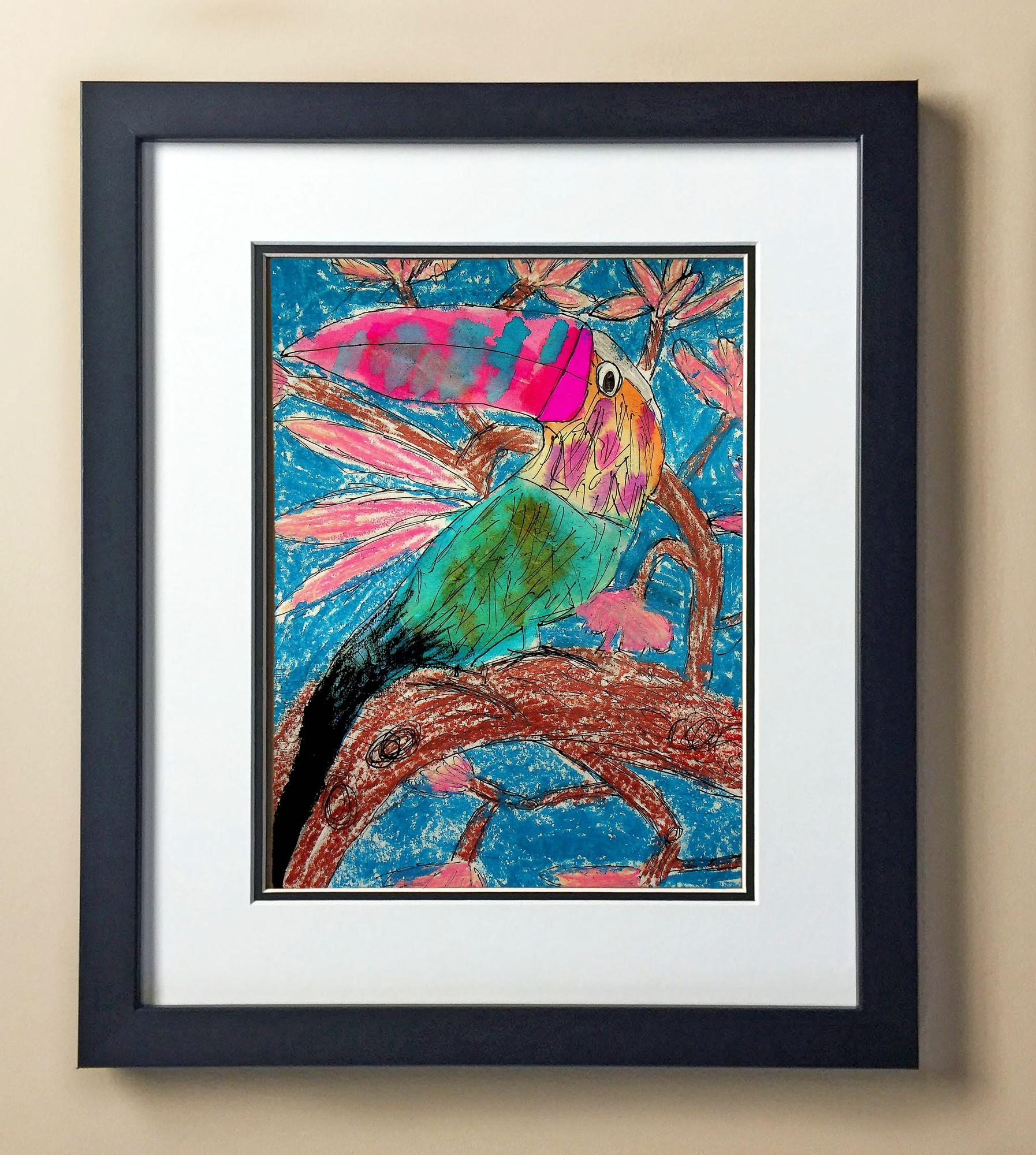 Included with the purchase is the Students Artwork, Frame, double matboard, shatter proof plexiglass, and a ready to hang backerboard with turnbuttons