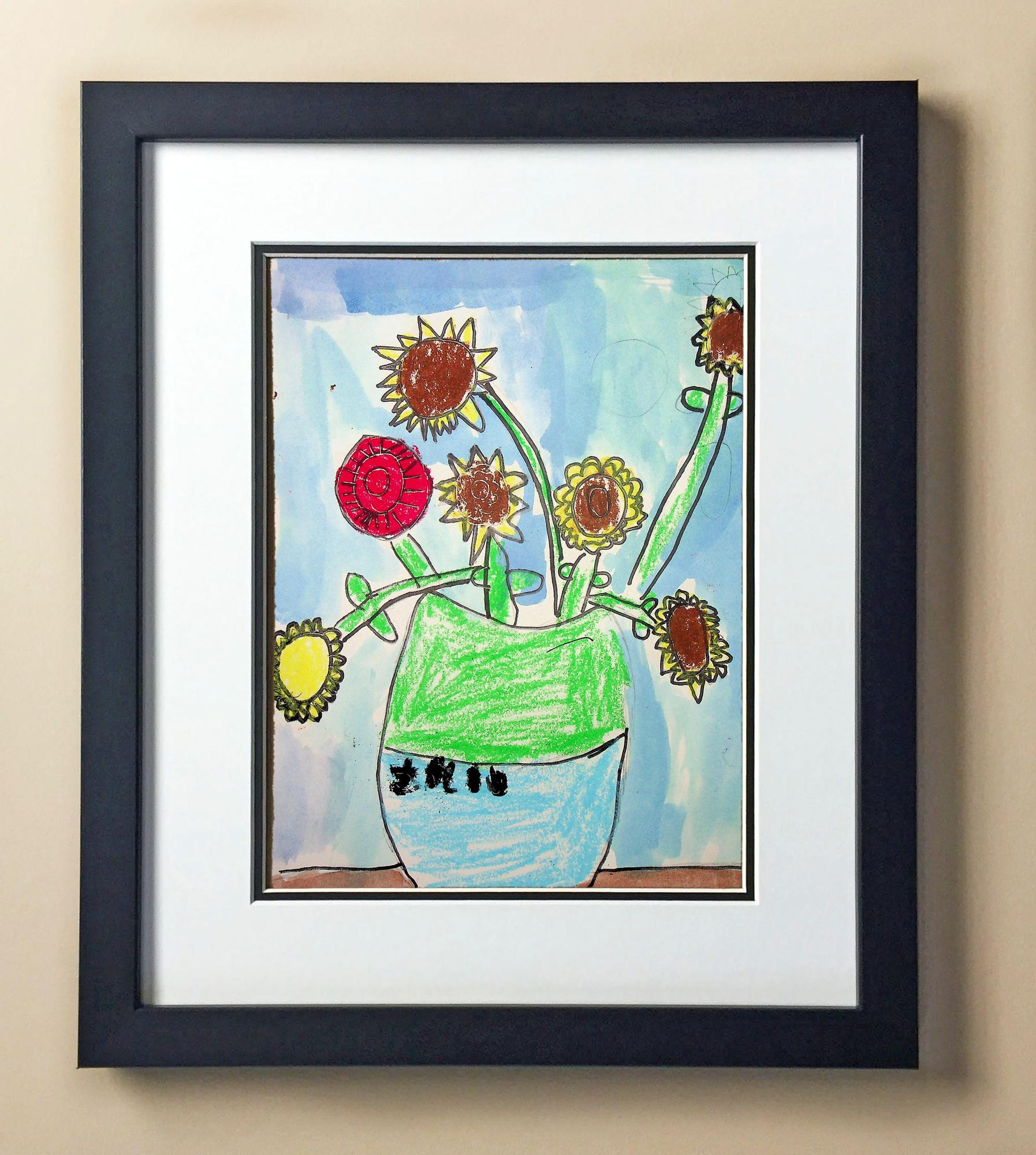 Included with the purchase is the Students Artwork, Frame, double matboard, shatter proof plexiglass, and a ready to hang backerboard with turnbuttons