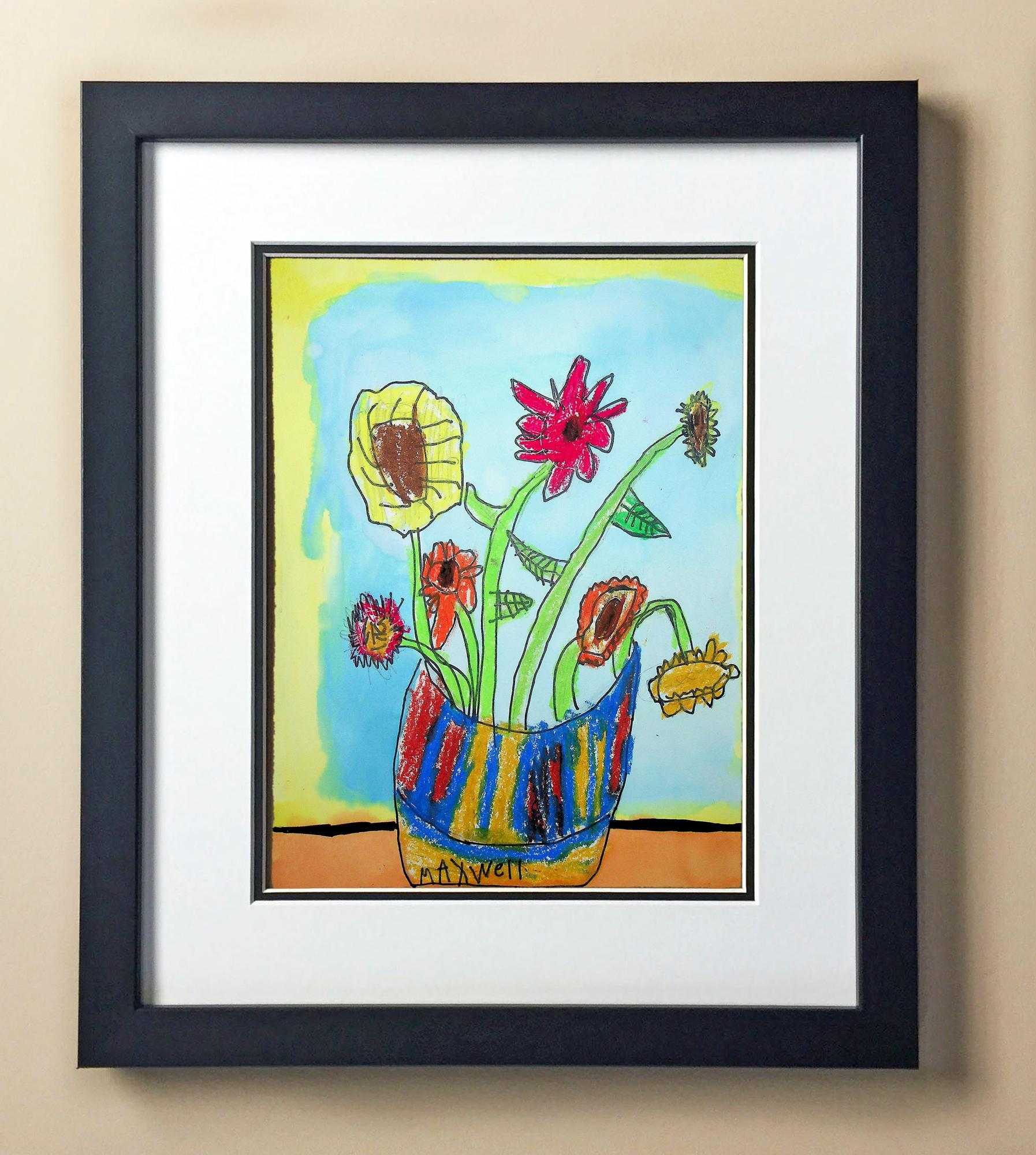 Included with the purchase is the Students Artwork, Frame, double matboard, shatter proof plexiglass, and a ready to hang backerboard with turnbuttons