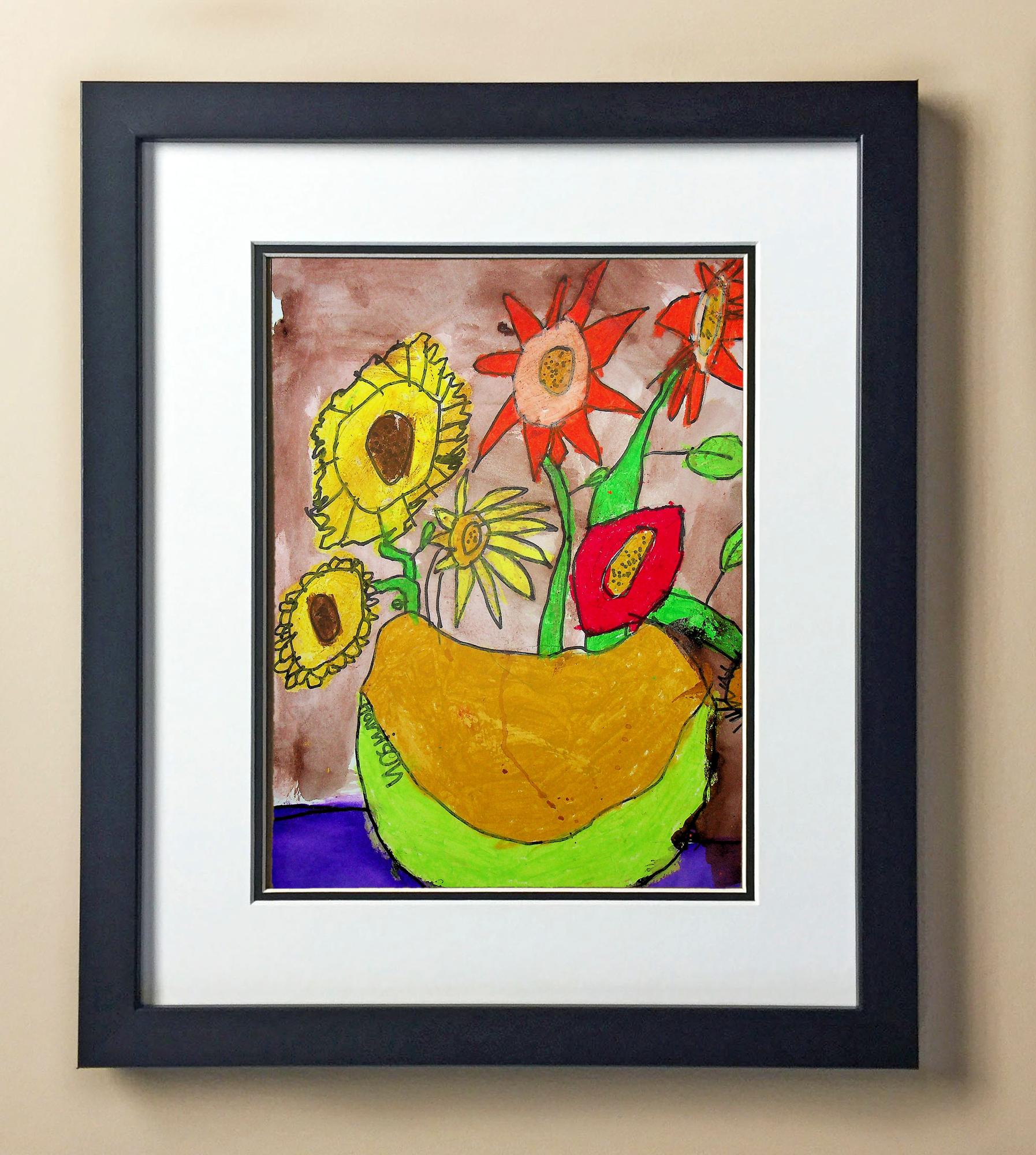 Included with the purchase is the Students Artwork, Frame, double matboard, shatter proof plexiglass, and a ready to hang backerboard with turnbuttons