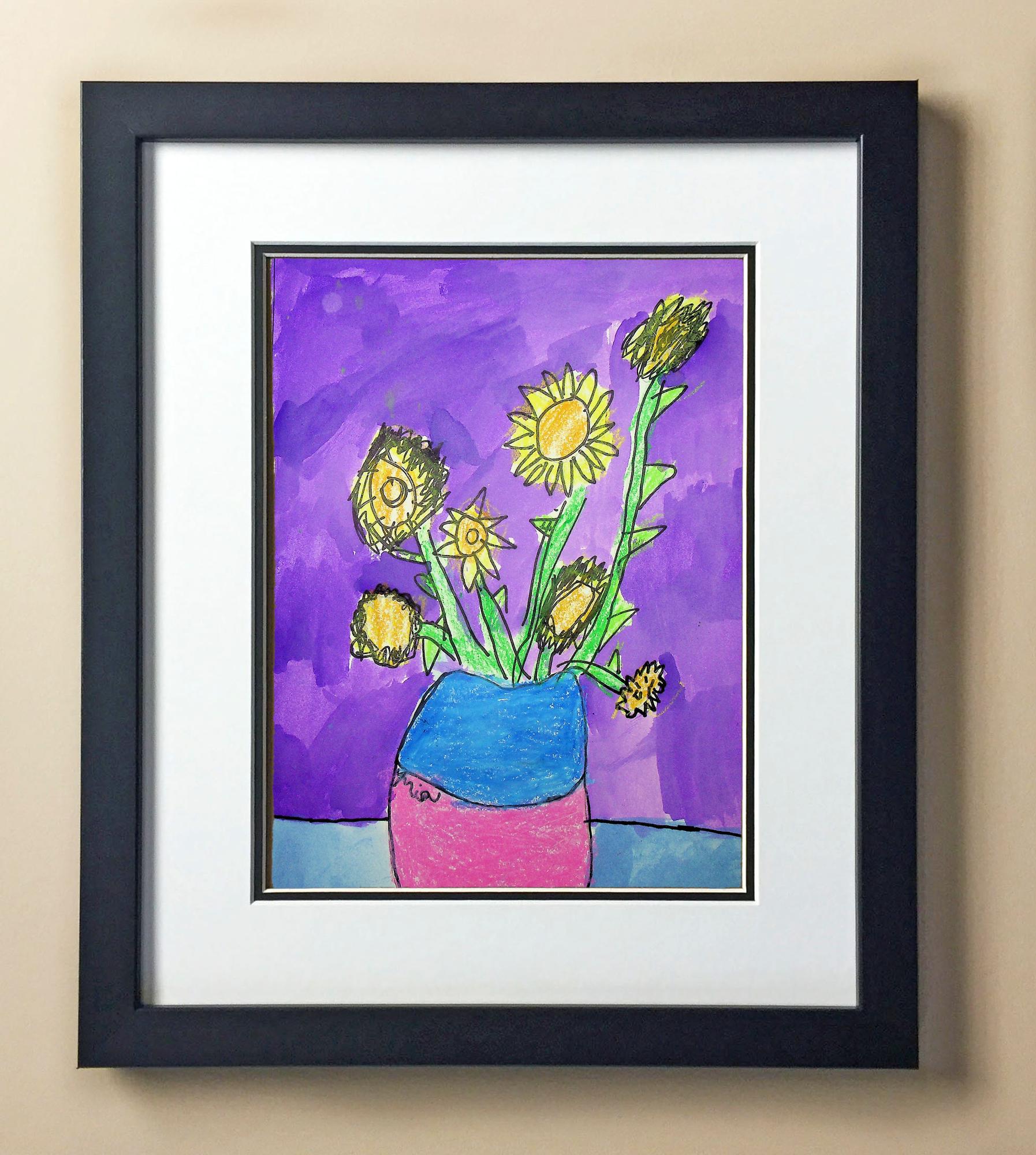 Included with the purchase is the Students Artwork, Frame, double matboard, shatter proof plexiglass, and a ready to hang backerboard with turnbuttons