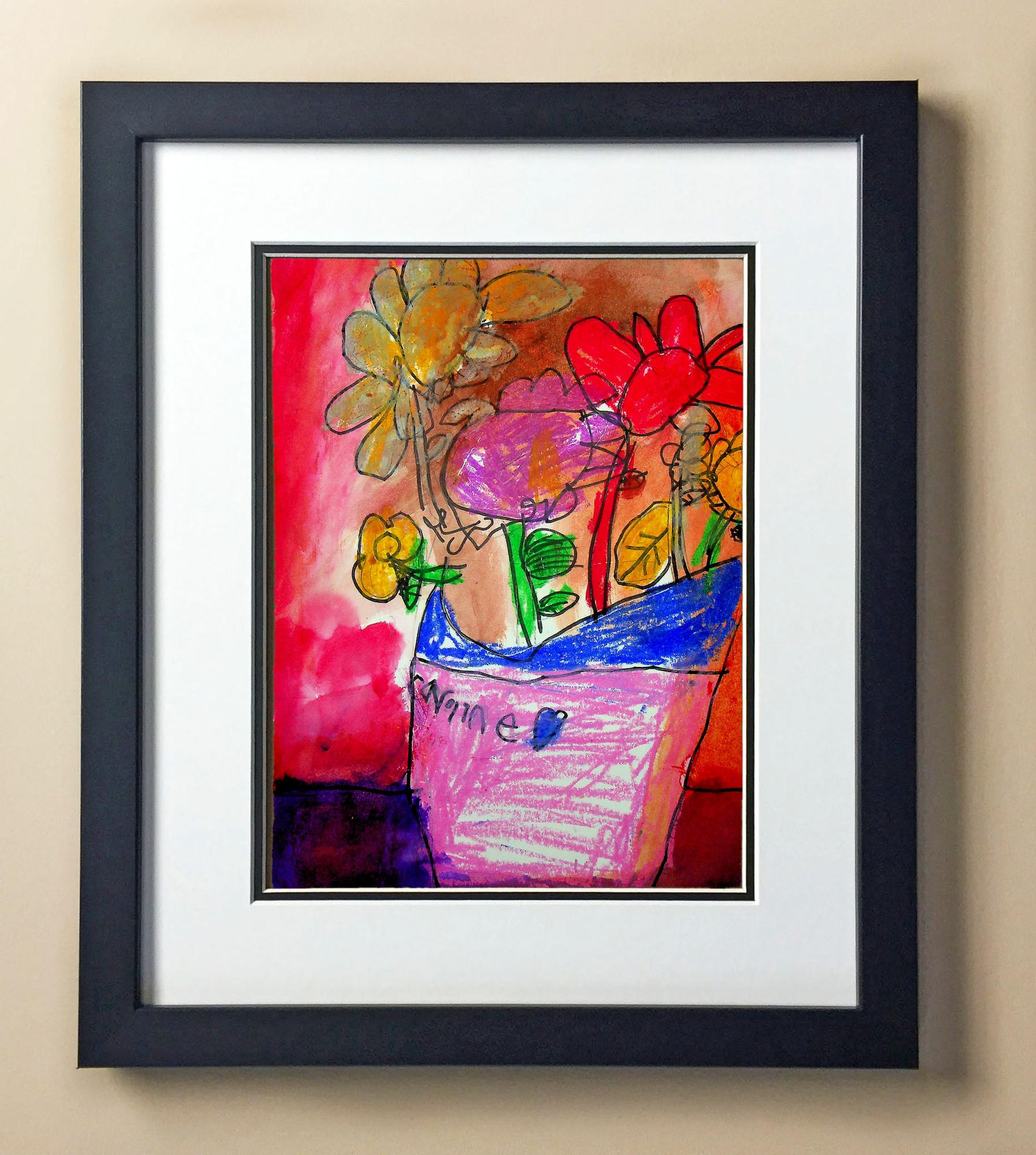 Included with the purchase is the Students Artwork, Frame, double matboard, shatter proof plexiglass, and a ready to hang backerboard with turnbuttons