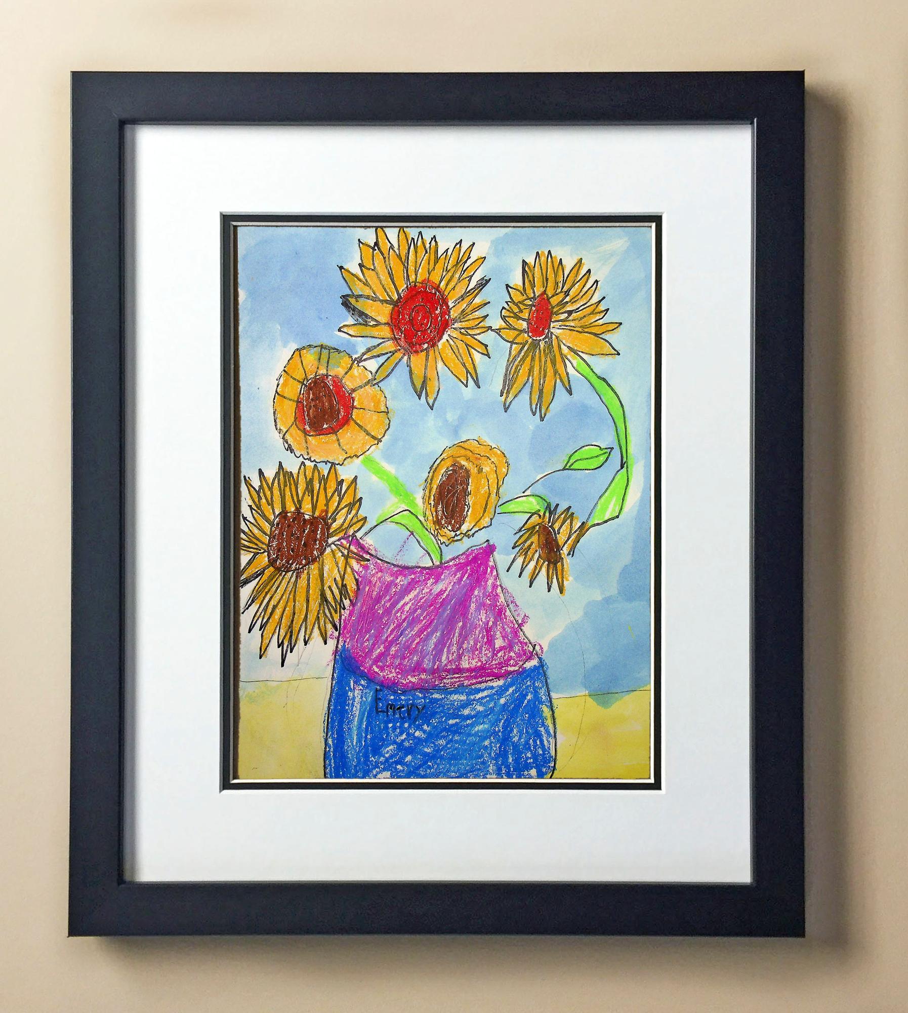 Included with the purchase is the Students Artwork, Frame, double matboard, shatter proof plexiglass, and a ready to hang backerboard with turnbuttons